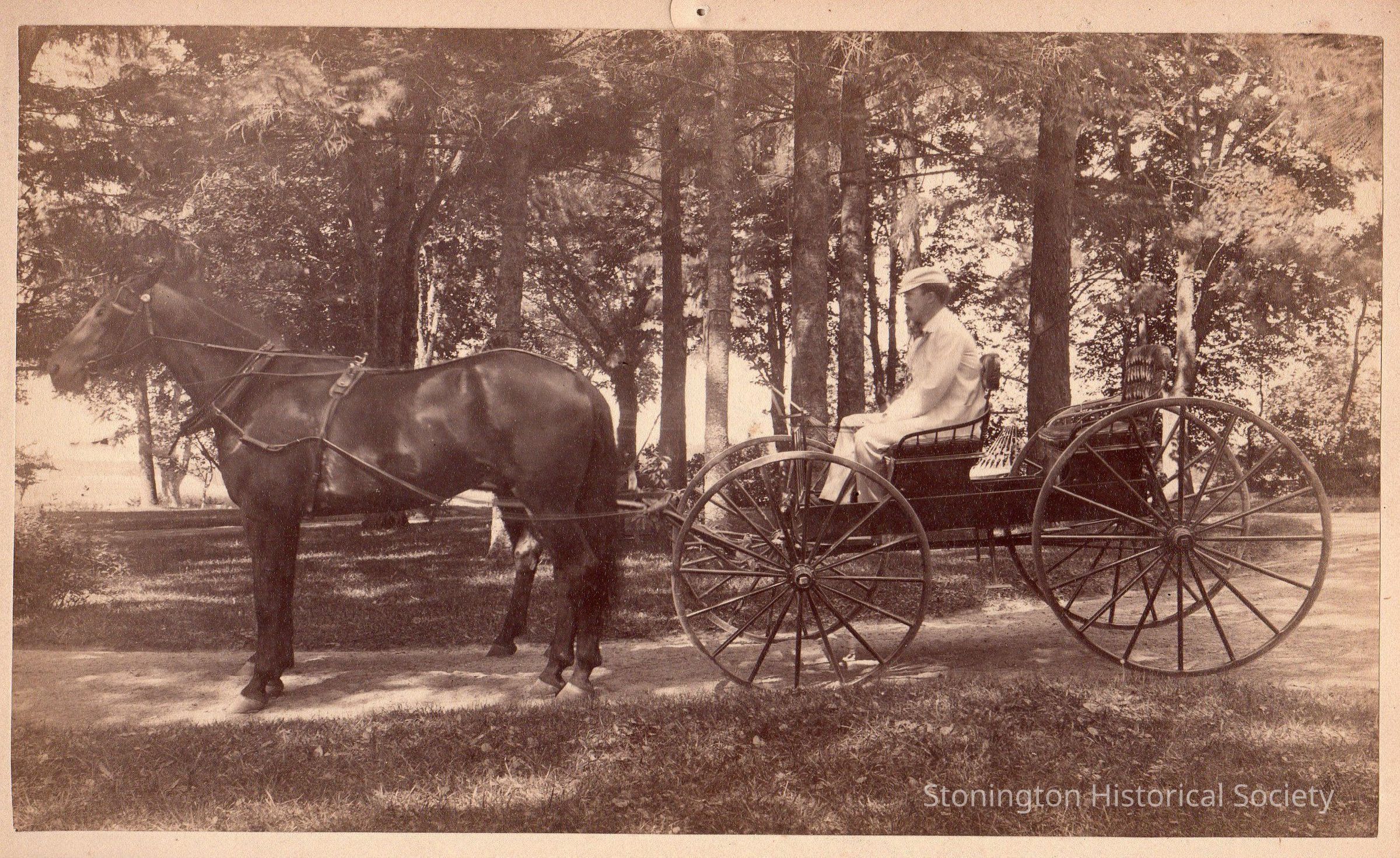 A photograph mounted on board. Man in a horse drawn carriage in the driveway directly in front of the south porch of the main house at Stone Acres. The hammock seen in other photographs from this series is visible in the background. He is possibily Eugene Phelps Edwards or a relative of Eugene and his wife Eliza Kendall Adams.Collection