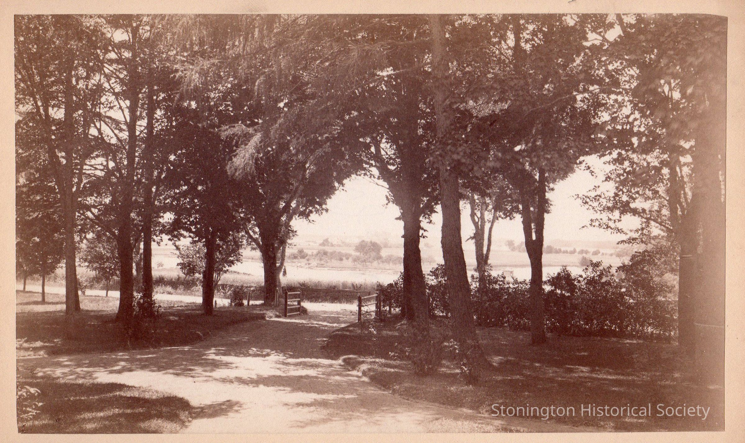 A photograph mounted on board. View looking out over the driveway and across North Main Street from the front porch of the south side of the main house at Stone Acres.Collection