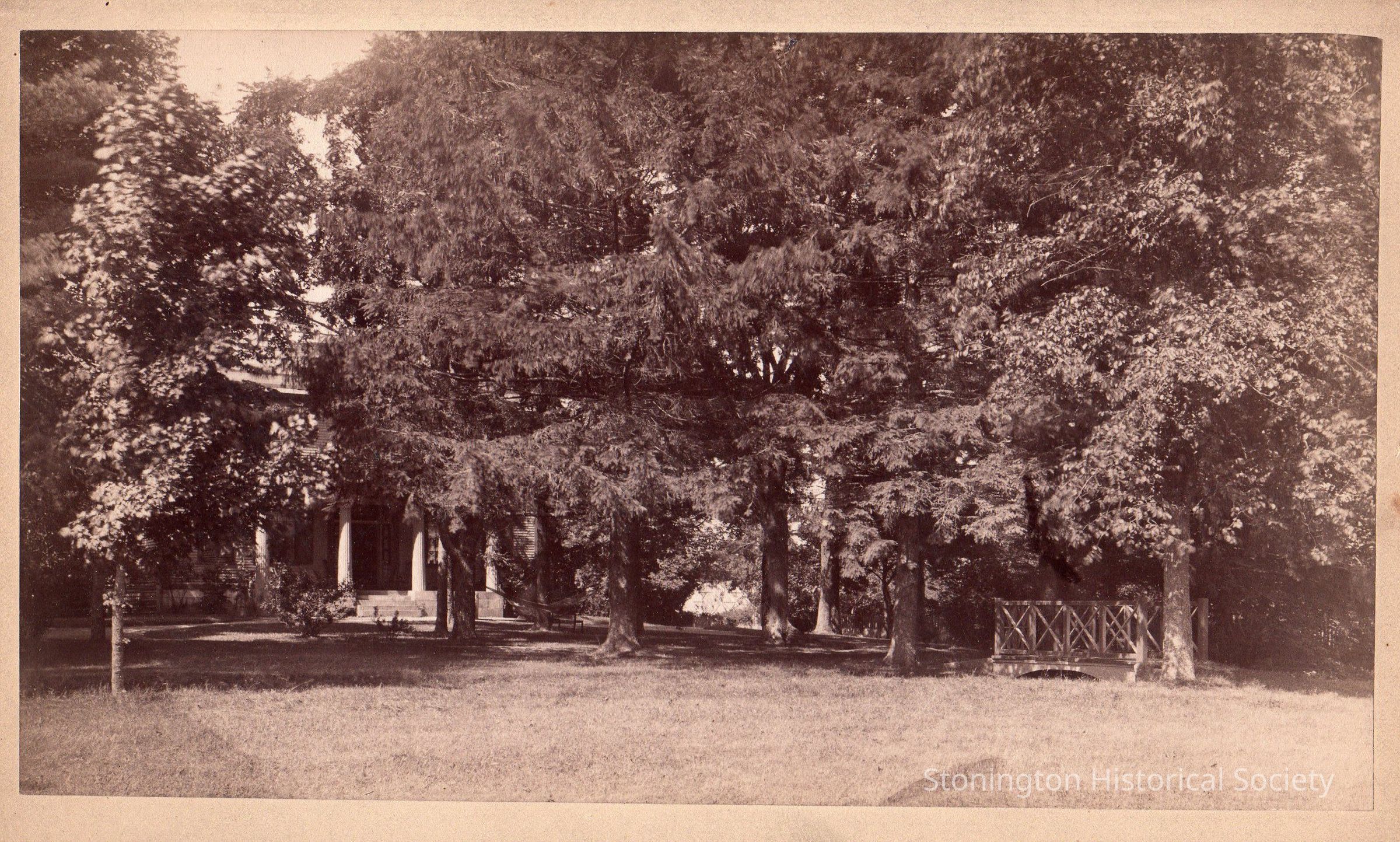 A photograph mounted on board. View of the southside of the main house at Stone Acres, wooden footbridge visible in the foreground. c. 1900