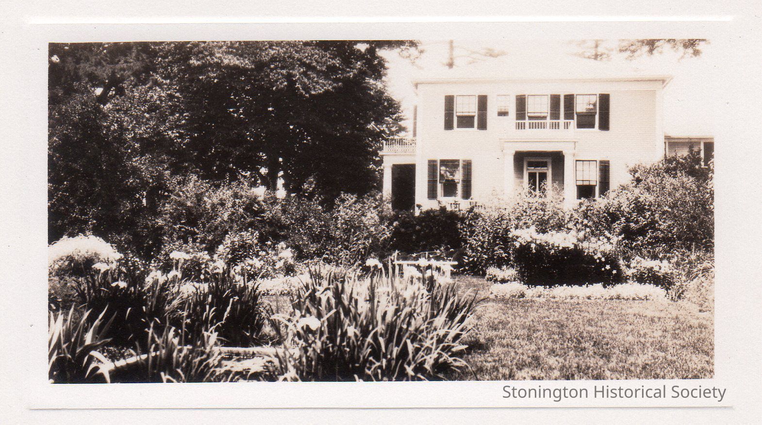 black and white photograph printed on cardstock, view of the east side of the main house at Stone Acres from the flower gardens.