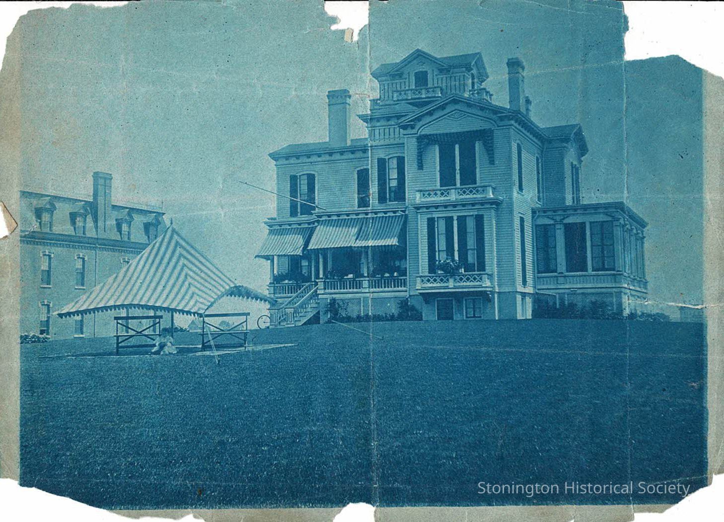 The reverse of this photograph refers to it as the Eugene Atwood House, placing the photograph between 1888 and 1926. This is likely closer to 1900, in comparison to 2025.212.7 which shows a large growth of ivy from the plantings here. This also features a small tent in the front yard, where a child is playing. The Borough School is visible at left.Collection