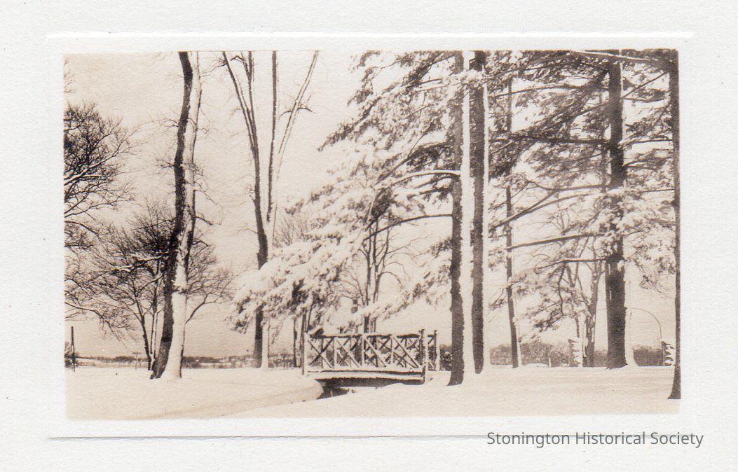 black and white photograph printed on cardstock, wooden foot bridge in front of the Stone Acres main house in winter, c. 1934