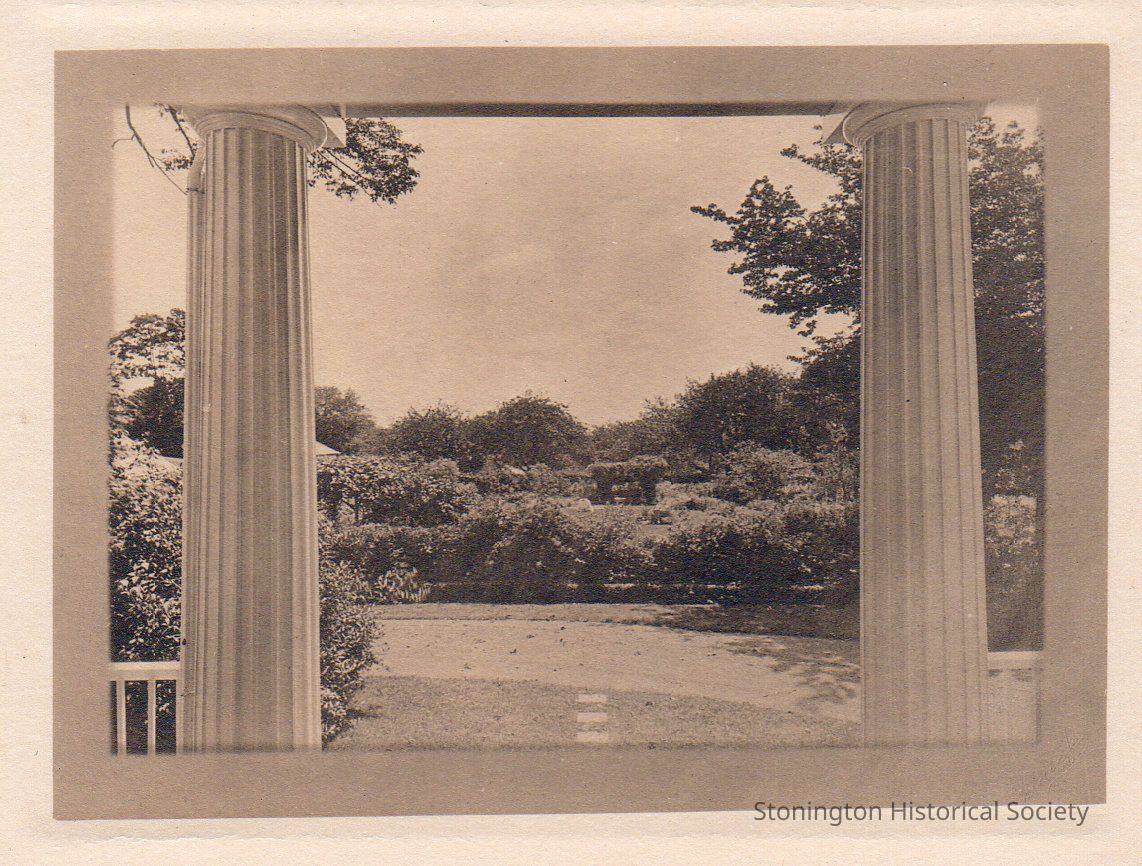 black and white photograph, view from the east side porch of Stone Acres, overlooking the flower gardens with the rose arbor in the distance, c. 1934.
