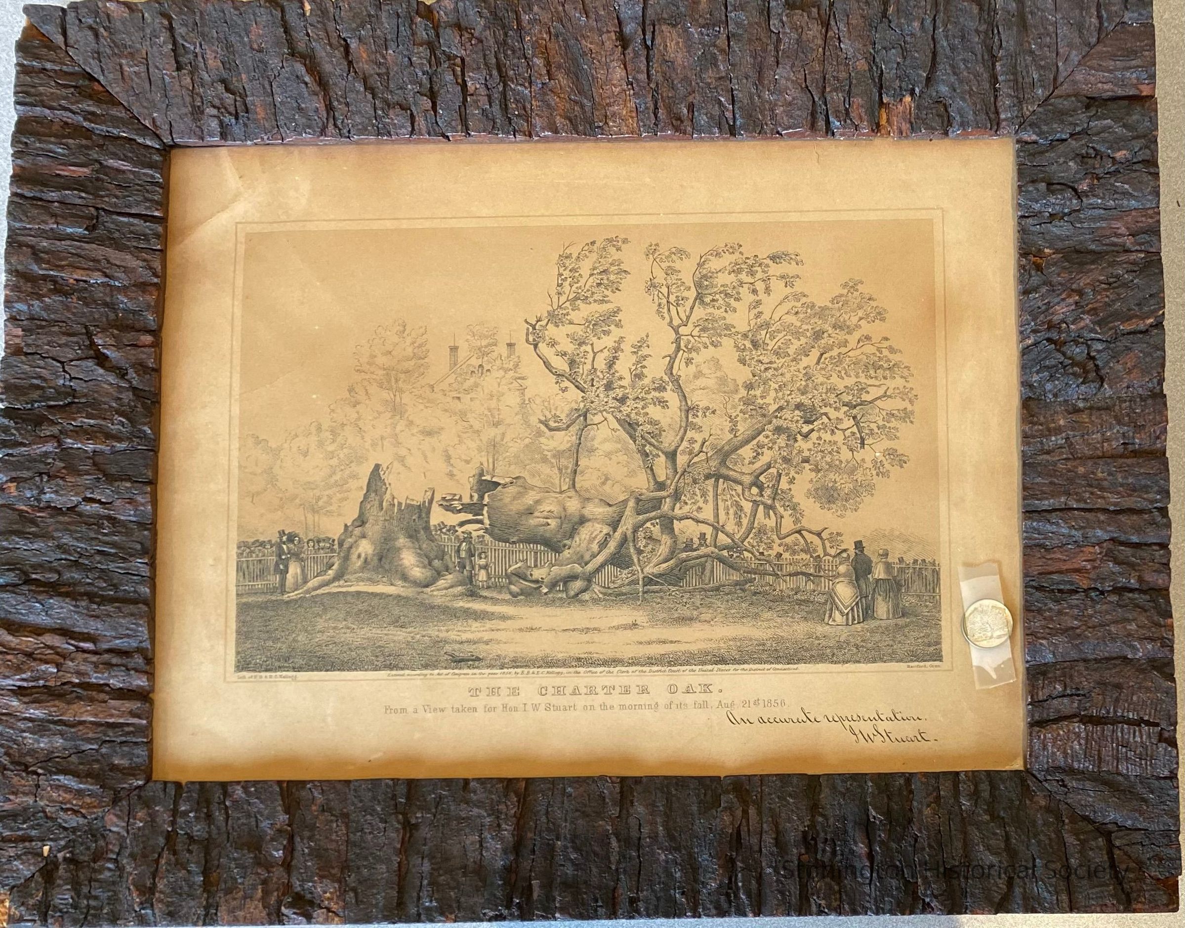 Lithograph print of Charter Oak in frame made of bark, 16.75" x 20", made by E.B. & E.C. Kellogg, 1856. Signed, "This is an accurate representation, I.W. Stuart." Charter oak medallion taped to the front of the frame. Several news clippings and handwritten notes are taped to the back.
