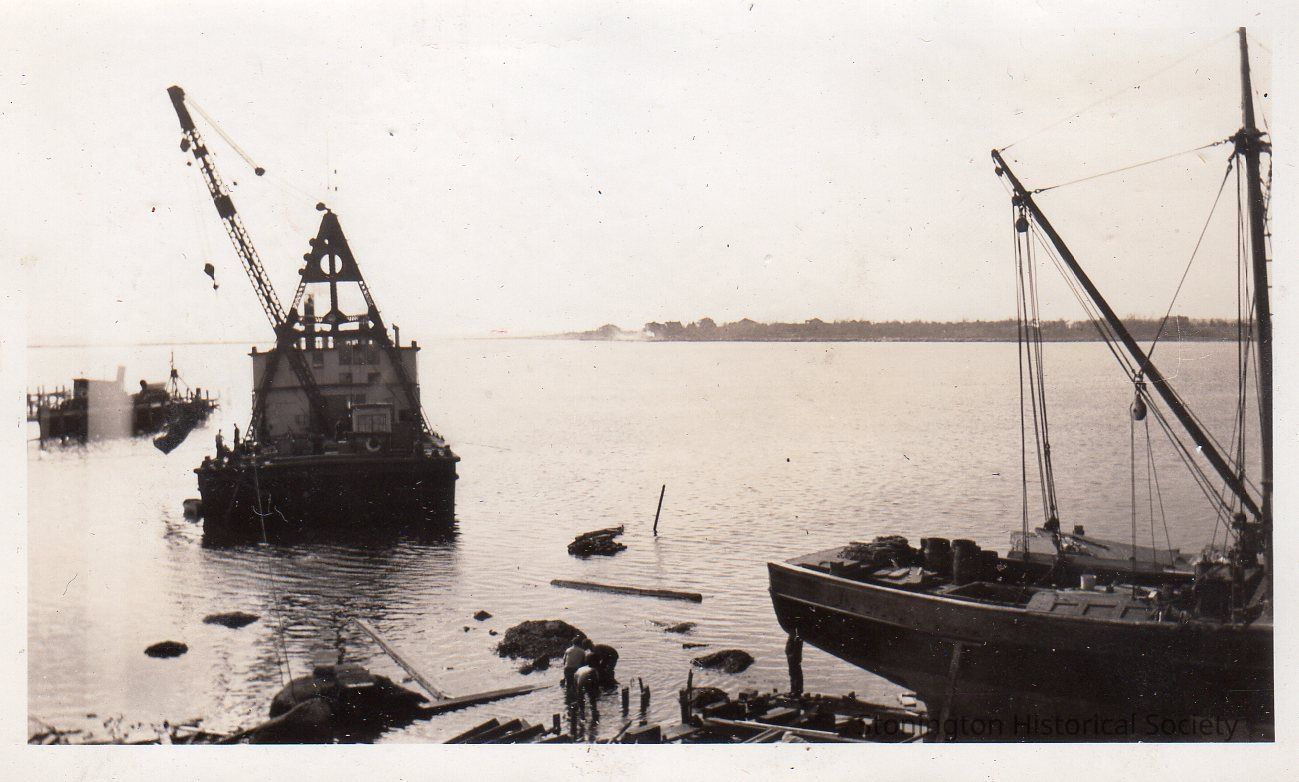 Black and white photograph, the lighter removing rocks to prepare for the launching of the RUSSELL S. from 92 Water Street following the 1938 Hurricane. From photograph album of Bertha D'Amico.