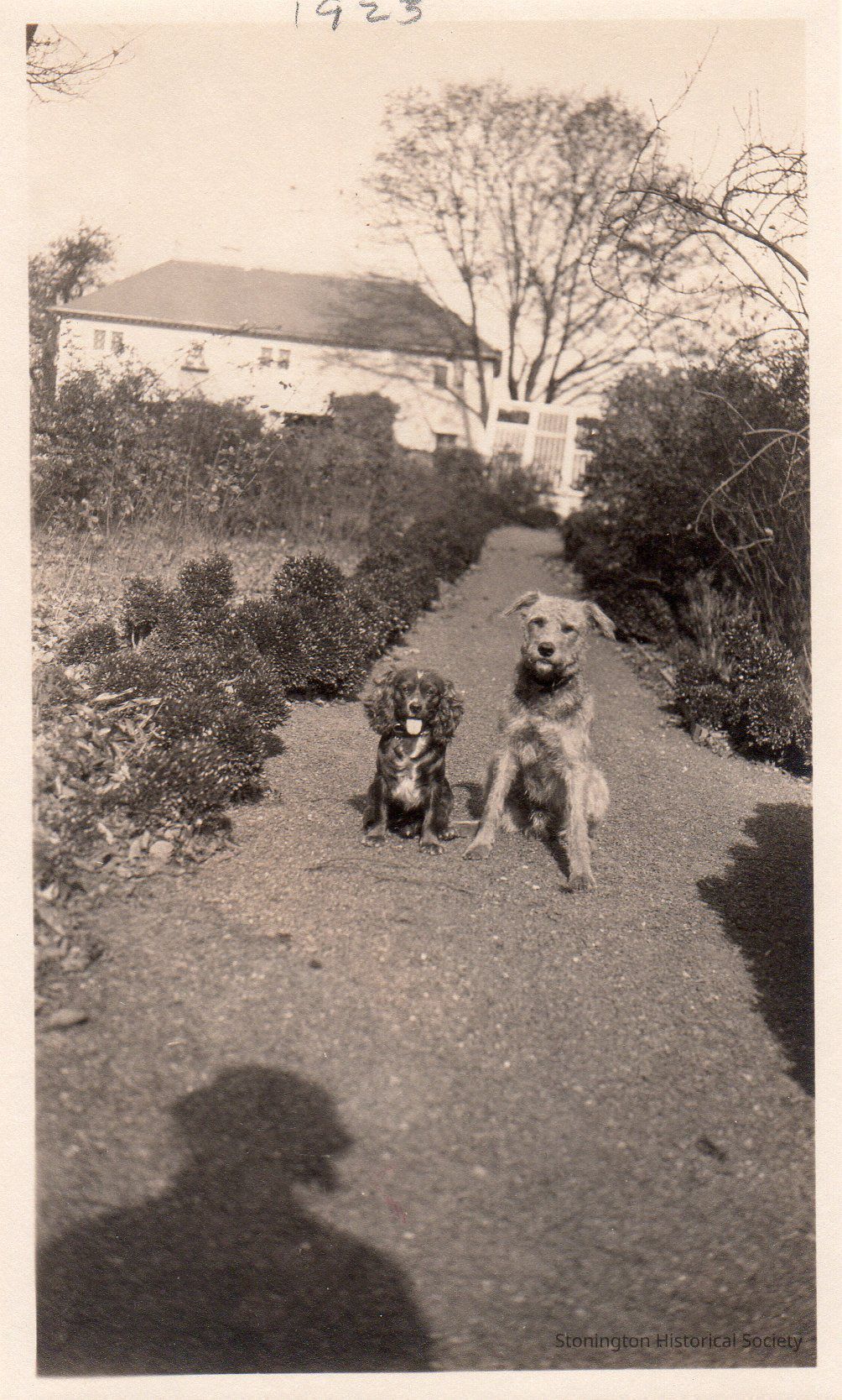 black and white photograph of Edwards family dogs in the gardens at Stone Acres, 1923.