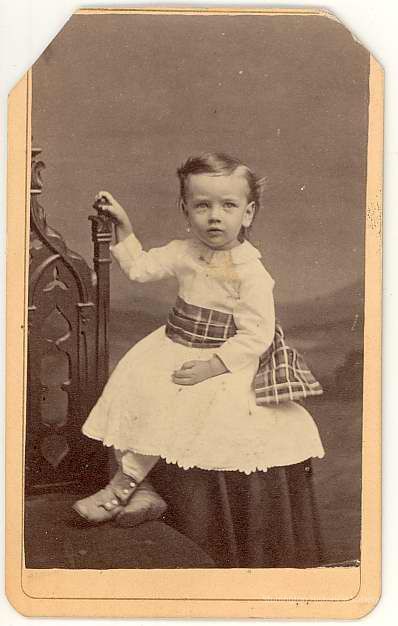 Seated full length of "W. A. H." in white dress and plaid silk sash; approximately 2 years old