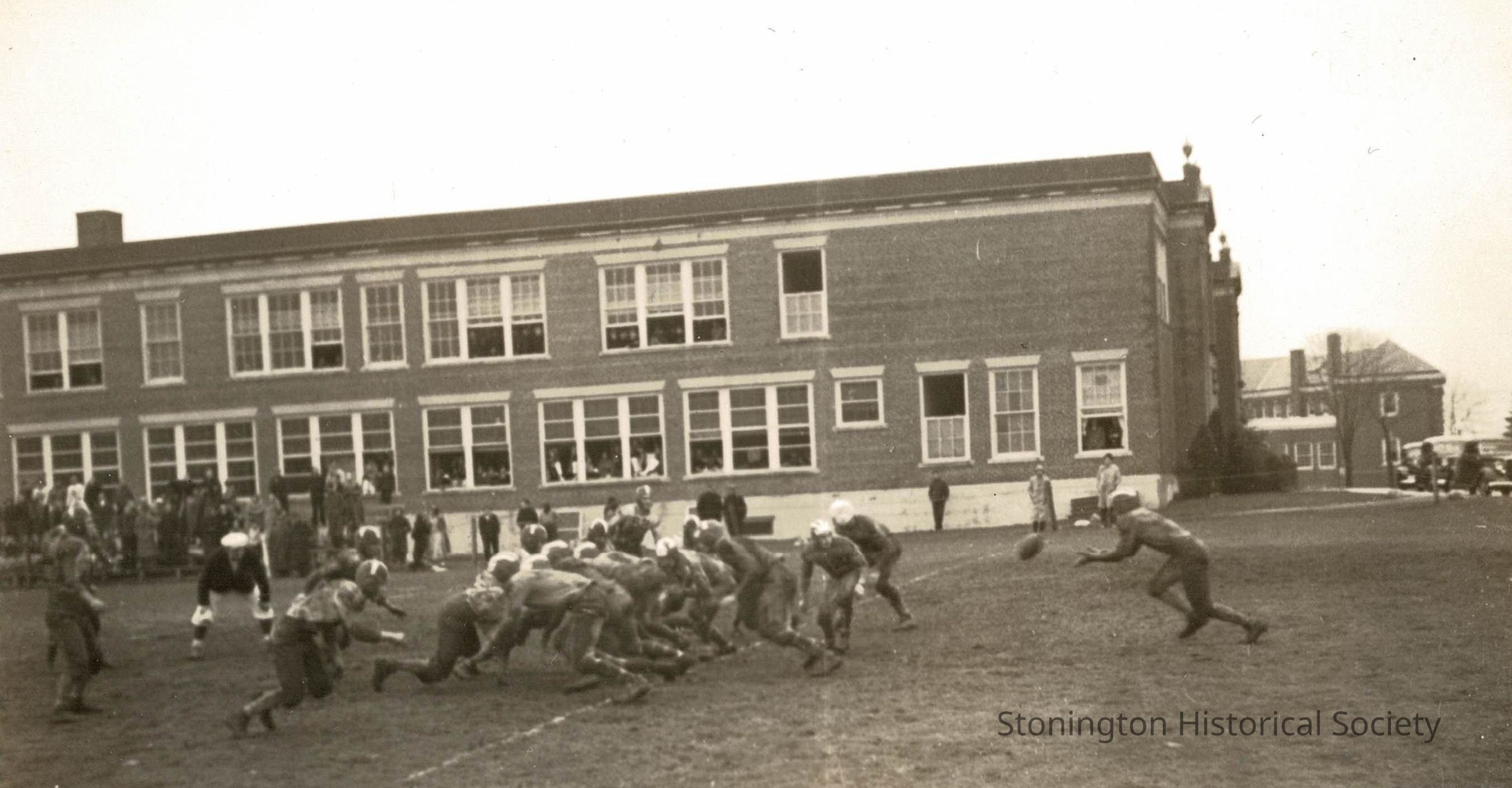 A black and white photograph of the Stonington High School football team, playing a game at the old Fitch High School in Fort Hill, Groton. Reverse of photograph has the place identified as Pawcatuck Middle School, but further research has shown this is incorrect, due to other buildings visible in background.Collection