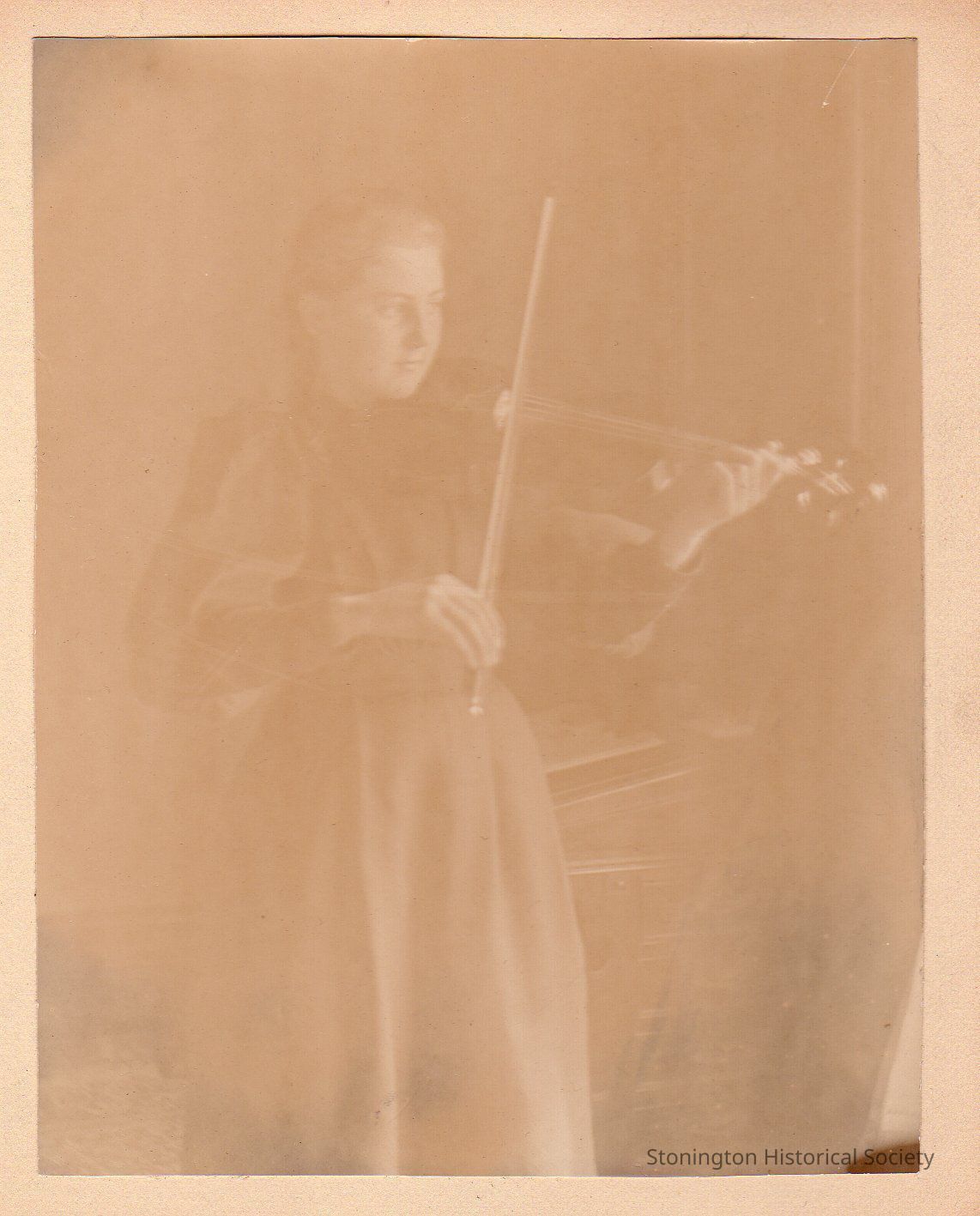 black and white photograph, mounted on board, of Helen Adams (Paffard) as a young girl, playing the violin
