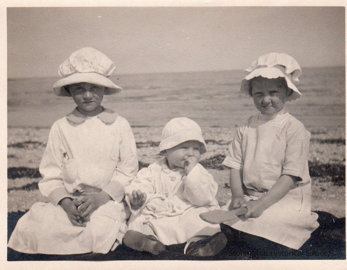 3 black and white photographs of Elizabeth, Jane and Fred Paffard Jr. at the beach as children, June 1916