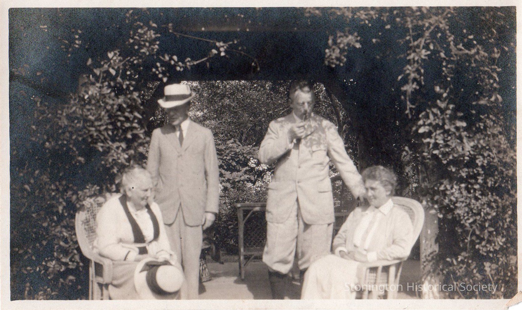 black and white photograph of Helen and Frederic Paffard, Eugene Phelps Edwards and Emma Tufts Adams in the gardens at Stone Acres