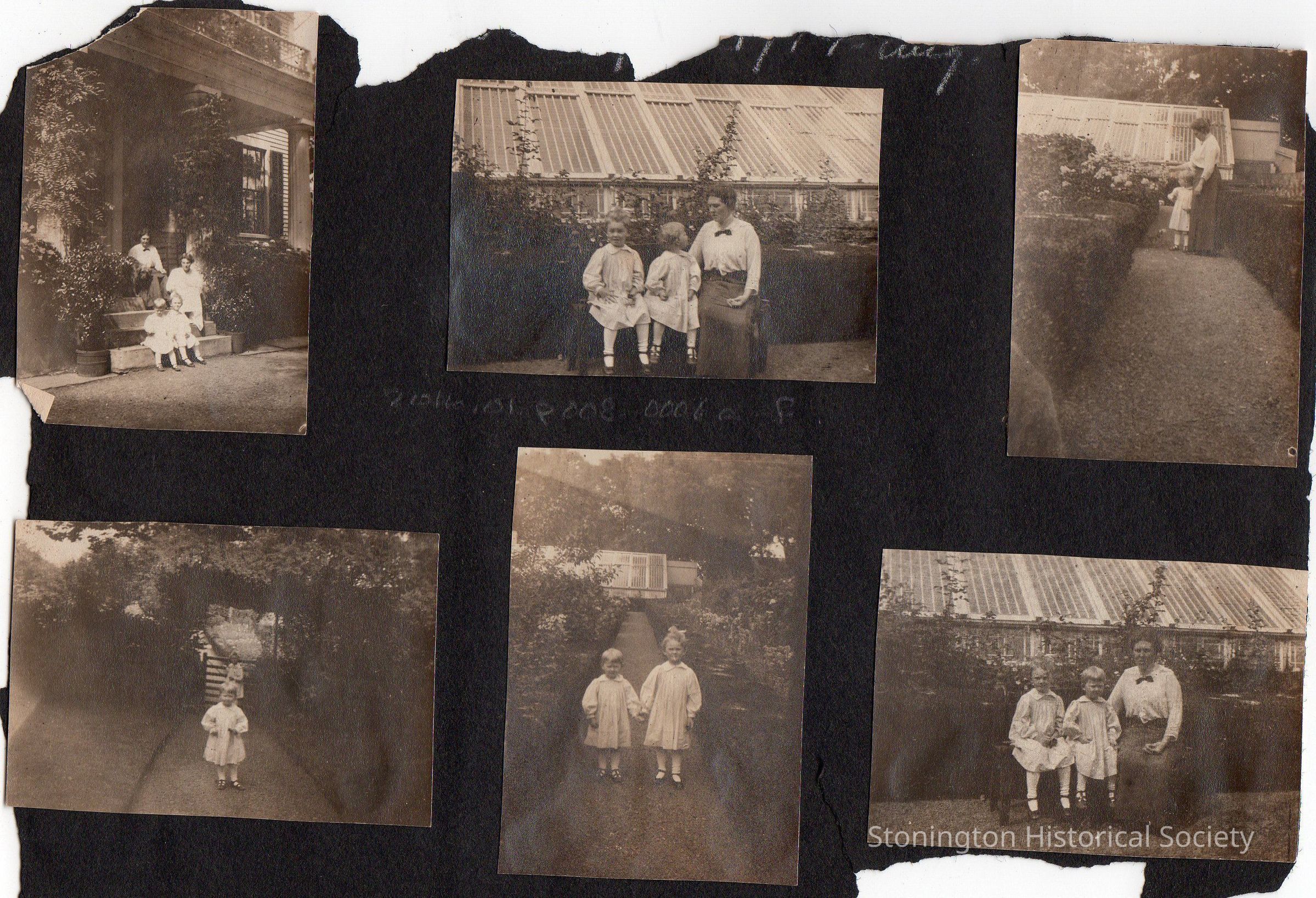 photograph album page with black and white snapshots of Elizabeth, Jane and Helen Paffard with Eliza Edwards at Stone Acres (porch, grapery and gardens are visible), c. 1914Collection