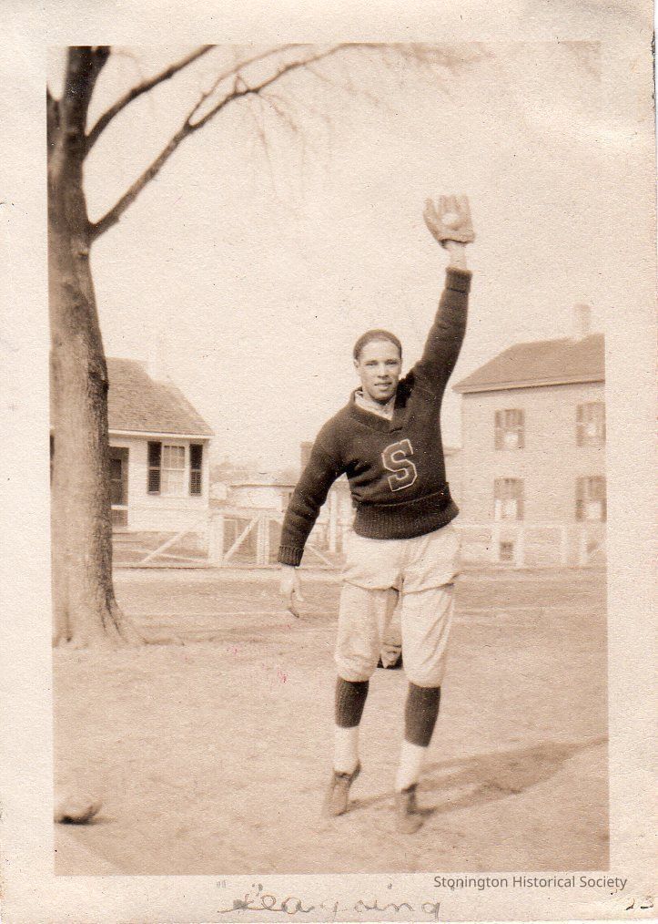 Photograph from the album, "The photographic life, moods and friends of Dorothea Hewett Gould, 1907-1942" (2002.0613.018). "Chief" Roland Ewelle in his Stonington High School baseball uniform, 1923-1924.Collection