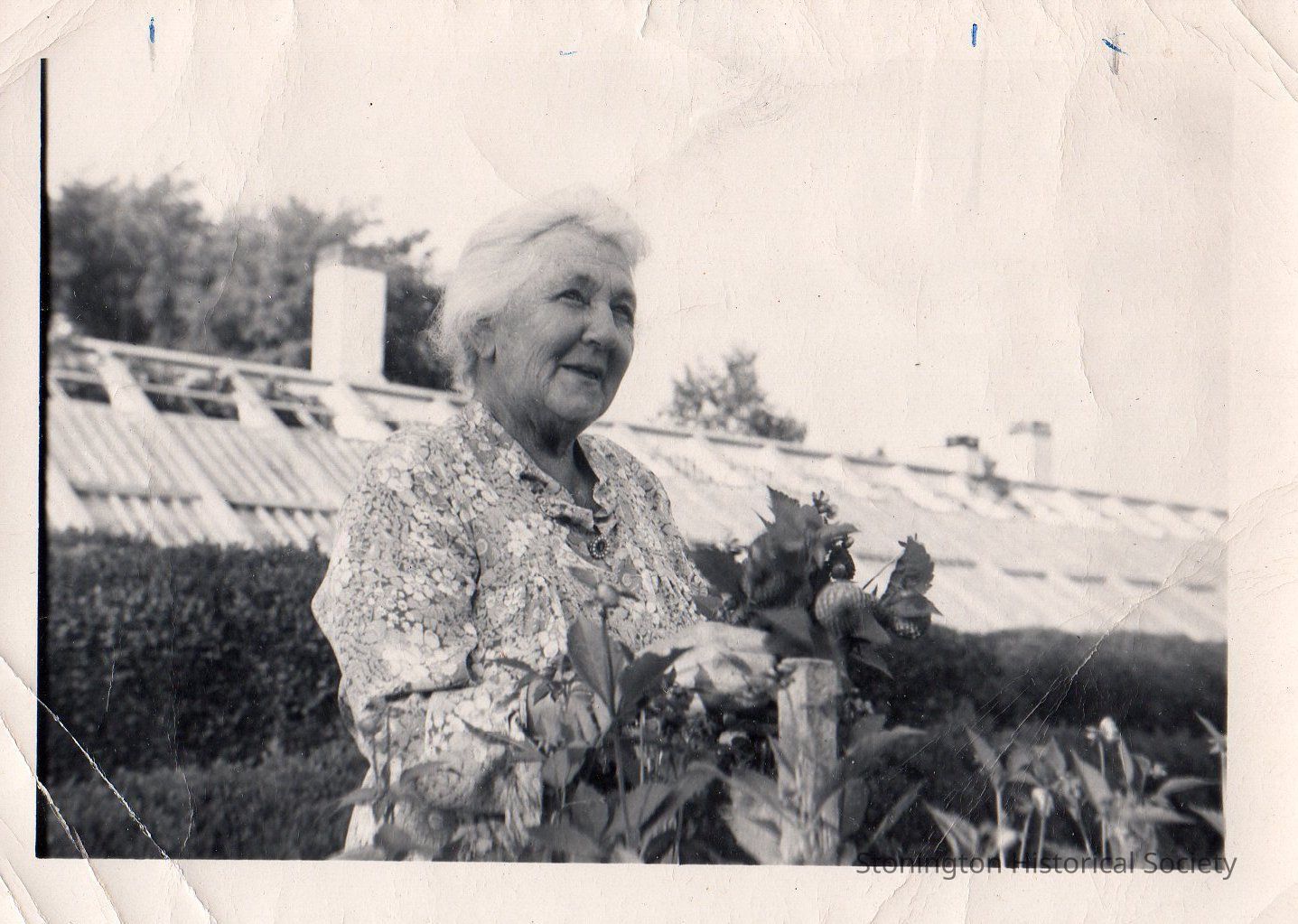 black and white photograph of Helen Adams Paffard at Stone Acres, c. 1950s. Grapery walls are visible in the background.