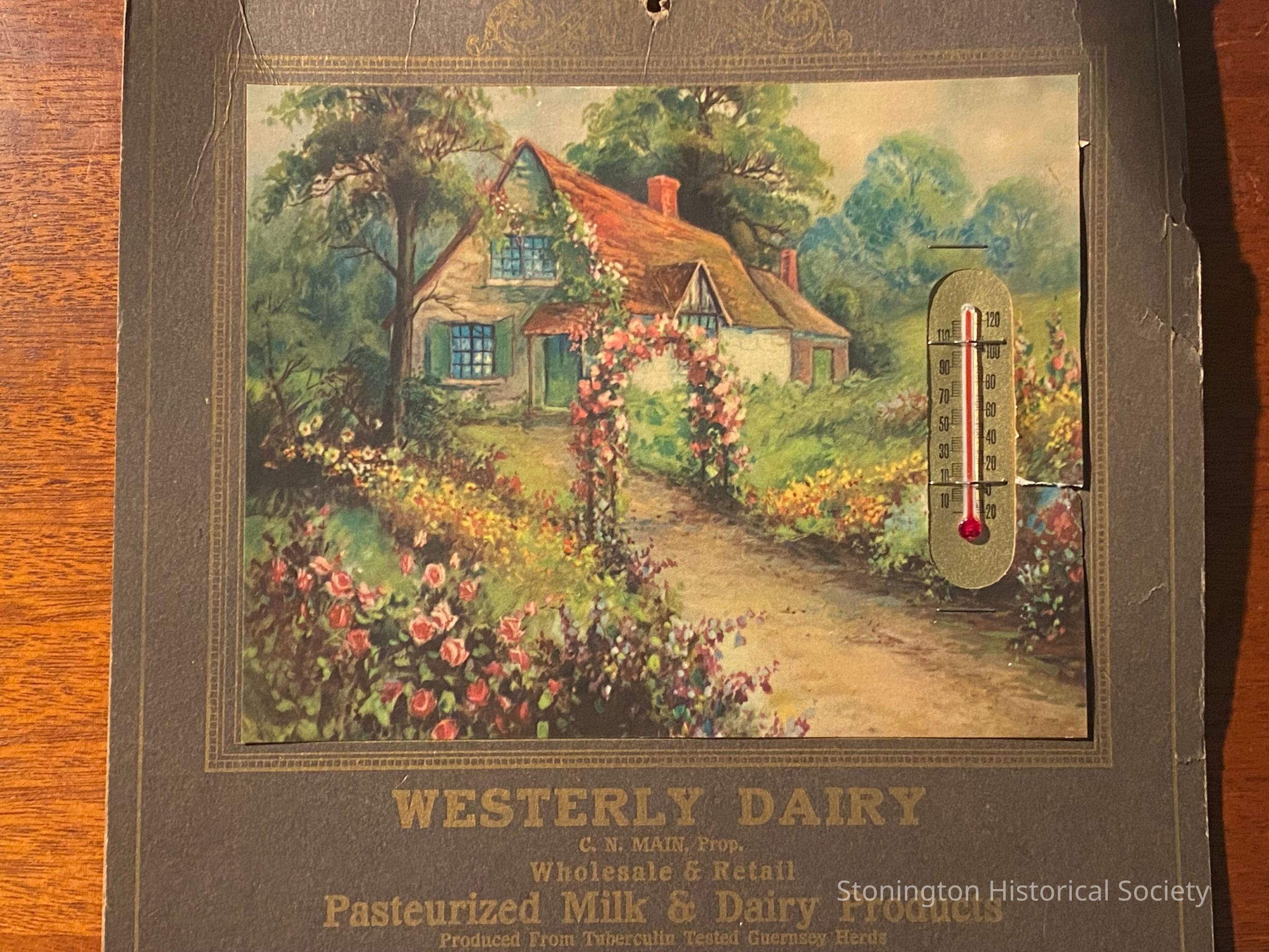 Wall calendar from 1937, produced by Westerly Dairy, never used. Cover flips up to reveal the nutritional value of a quart of milk, as well as helpful hints to housewives. There are also monthly budget sheets for the farmers to use. Each of these features specialized advice: First aid to the injured, domestic emergencies, What Every Family Medicine Chest Should Contain, Average Weight Chart, The New Baby, Feeding the Baby, Diet Schedule for the Baby, The Baby's Sickness, Tested Recipes, General Cooking Table. Beneath the painted image with the thermometer, are monthly tear-off calendars.Collection