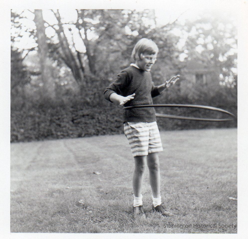 2 black and white snapshots of Heidi Paffard hula hooping, c. 1960s