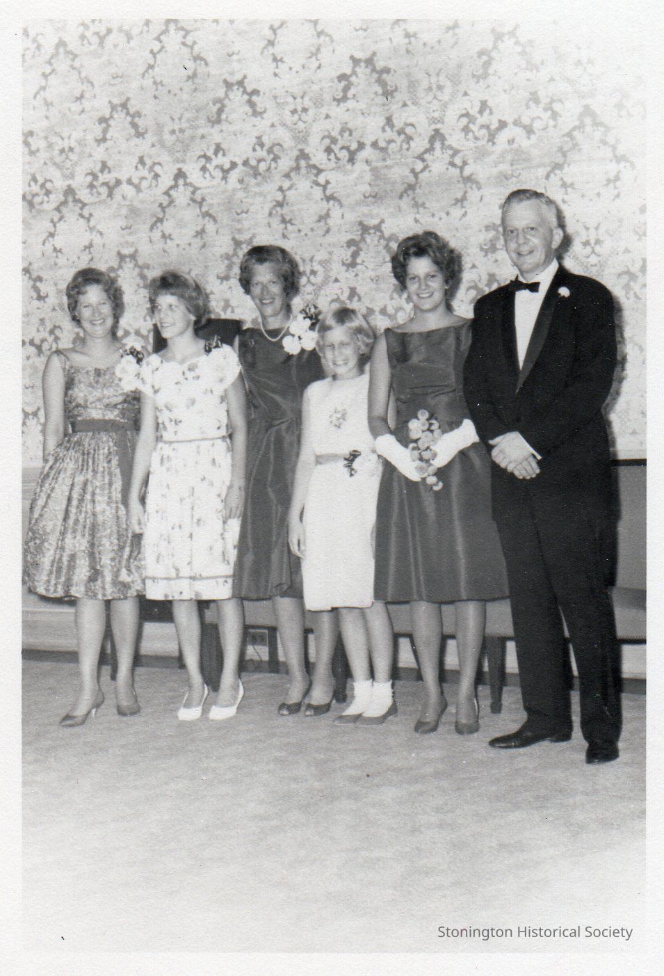 black and white Paffard Family photograph, l-r: Wynne, Heidi, Edith, Helen, Jane, and Fred Paffard, c. early 1960s.