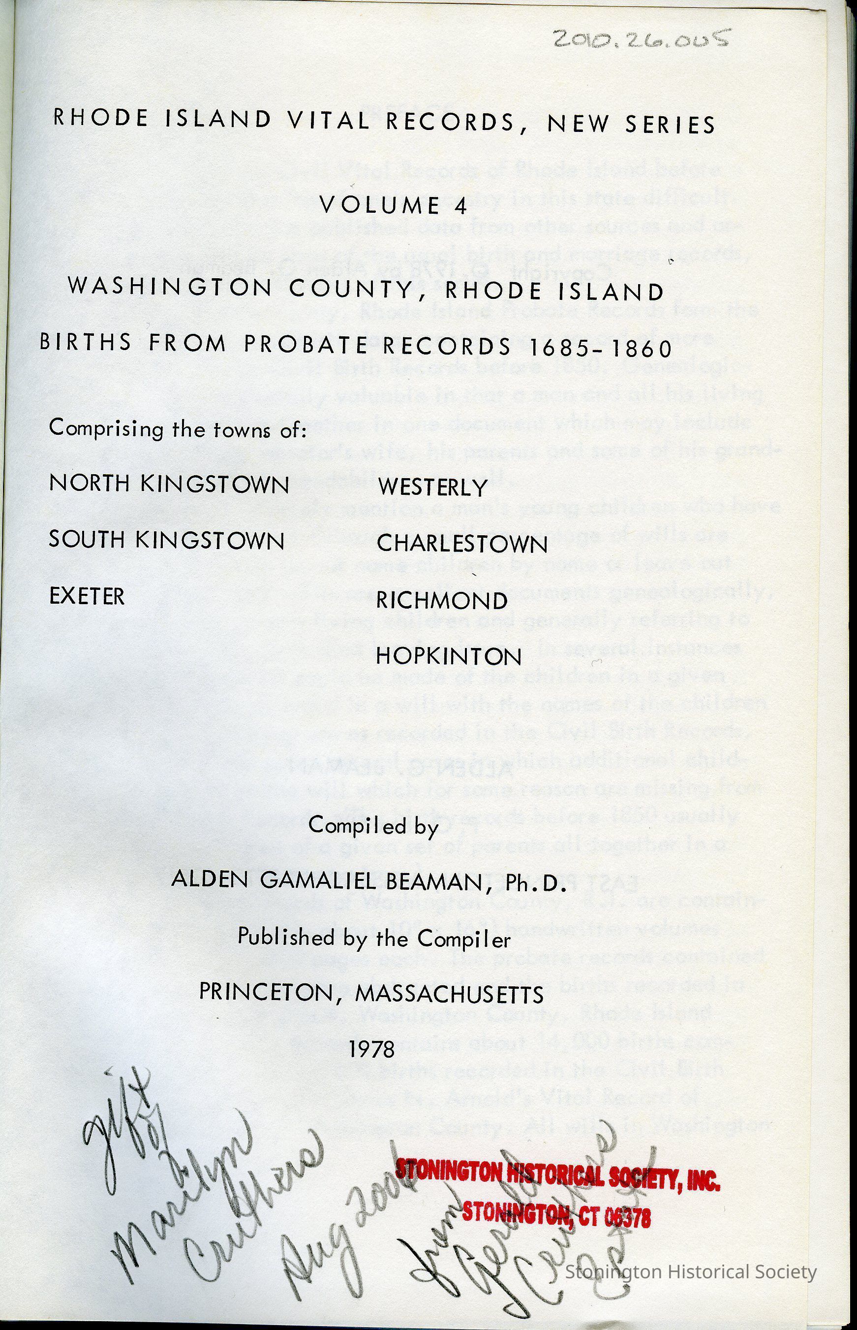 Washington County, Rhode Island births from probate records, 1685-1860 : comprising the towns of North Kingstown, South Kingstown, Exeter, Westerly, Charleston, Richmond, HopkintonEntry/Object ID