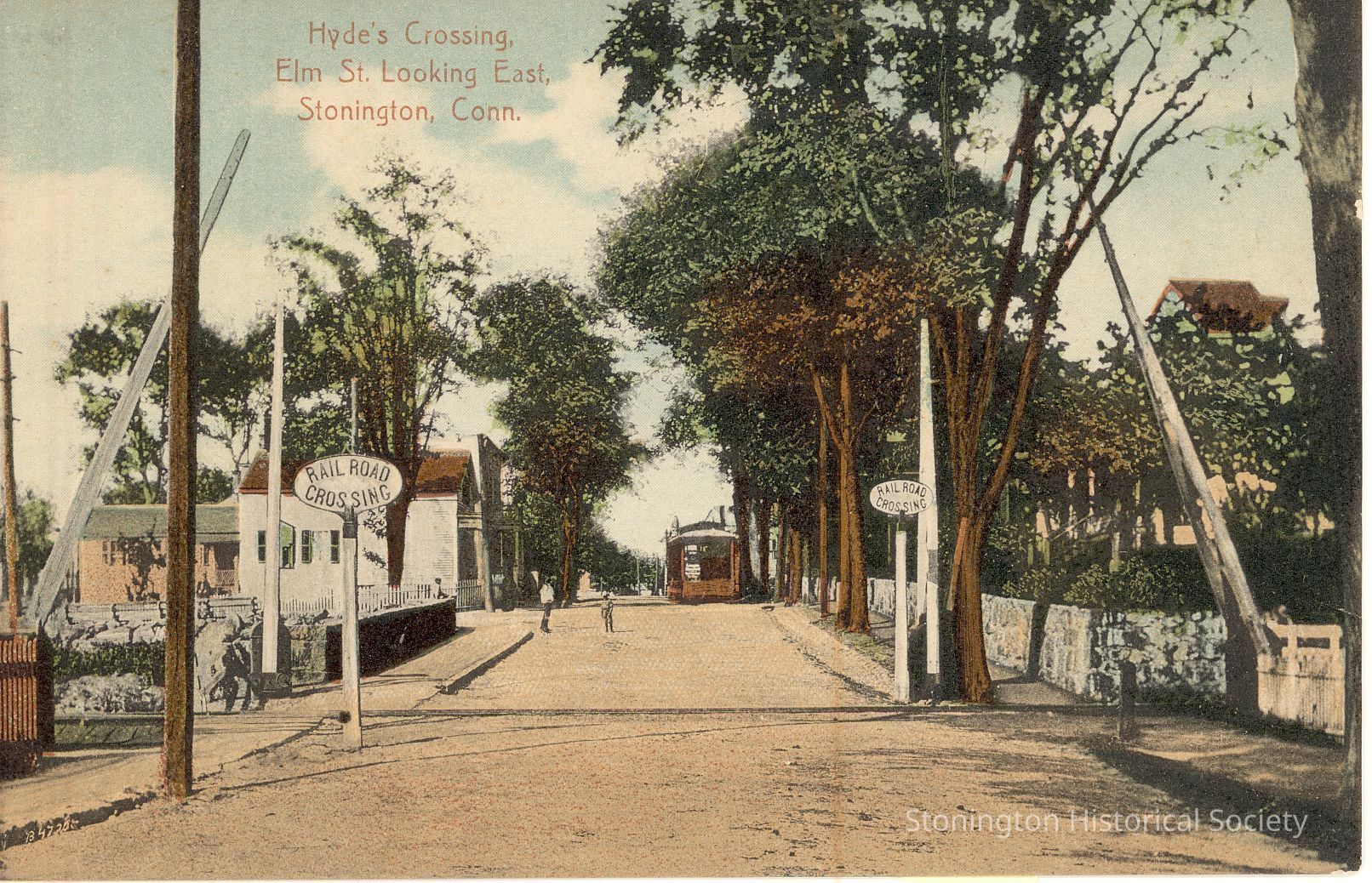Hyde's Crossing, Elm St. looking East, Stonington CT Note on back "really east? Cemetery wall on right"