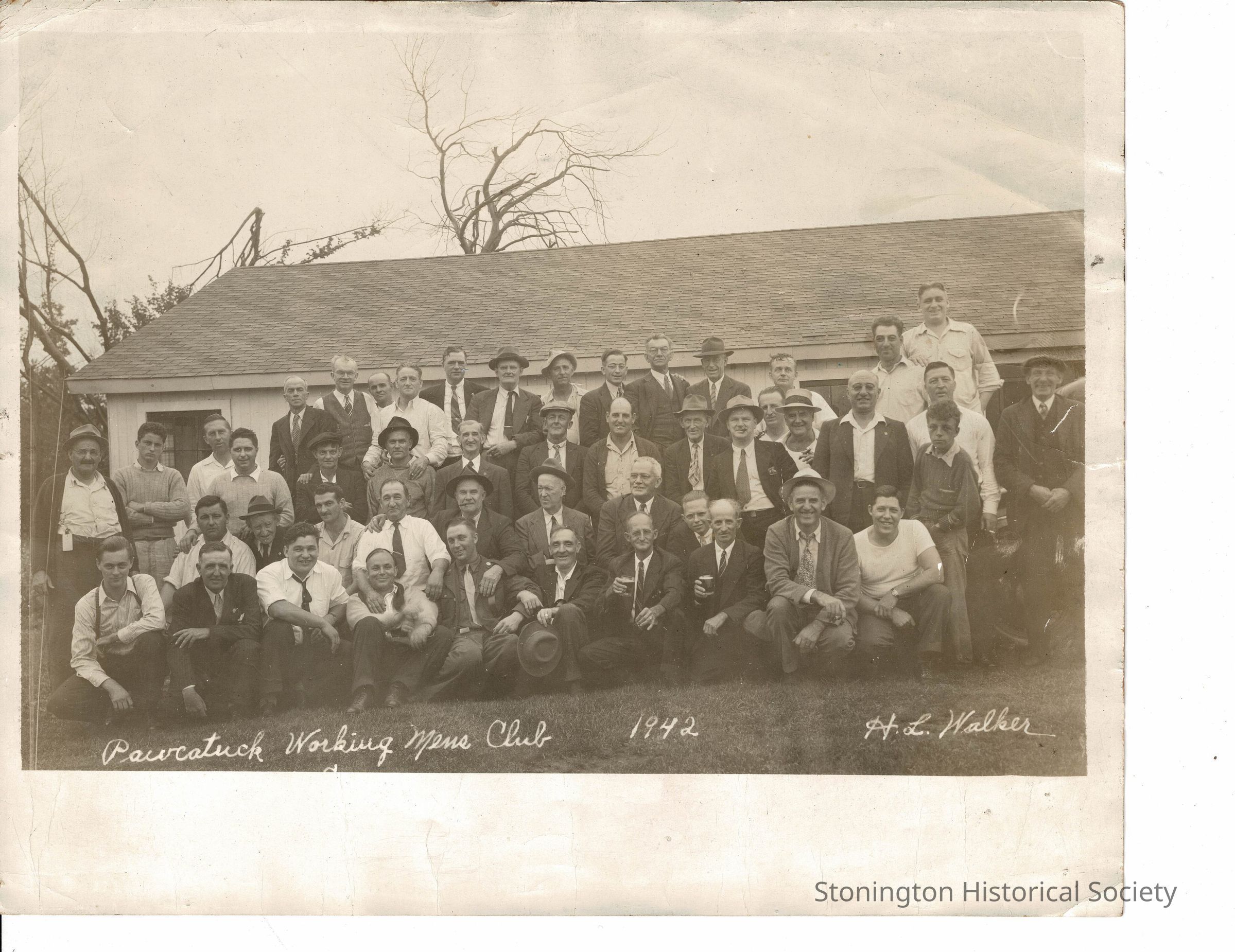 Photograph taken 1942 by H.L. Walker outside the Pawcatuck Working Mens Club. Most of the men appear middle aged, but a few are quite young or very old. None of the men in the photograph are identified.Collection
