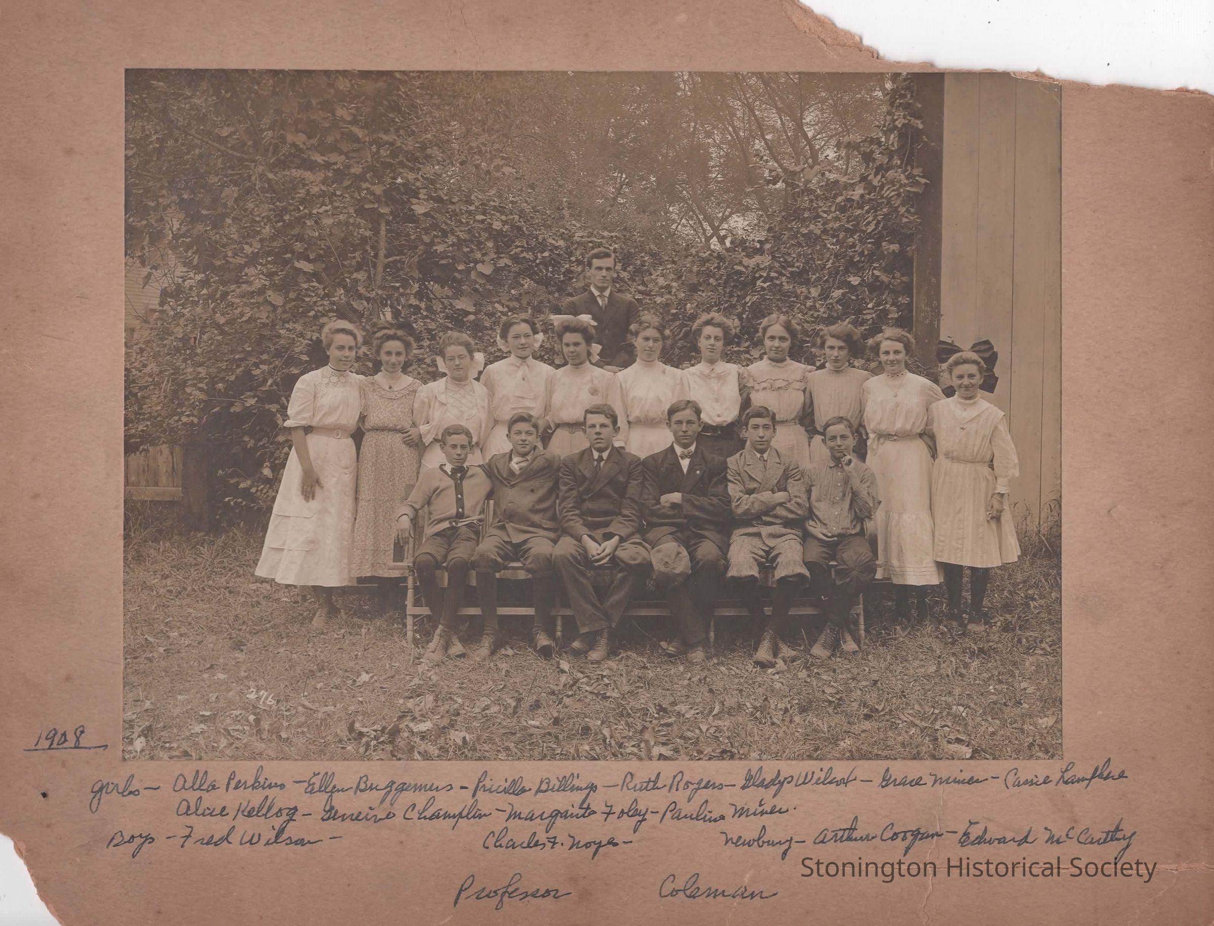 From a comment on facebook from a woman whose grandmother is in the photo and has her own copy (September 26, 2022): Alla Lynne Perkins, Ellen Boggenes, Priscilla Billings, Ruth Rogers, Gladys Wilcox, Grace Miner, Cassie Lamphere, Alice Kelloge, Genieva Champlin, Margaret Foley, Pauline Miner, Fred Wilson, Charles Howe, Charles Noyes, Raymond Newbury, Arthur Coogan and Edward McCarthy. The Teacher is listed as Professor W. H. Coleman and the photo is dated 1909.Collection