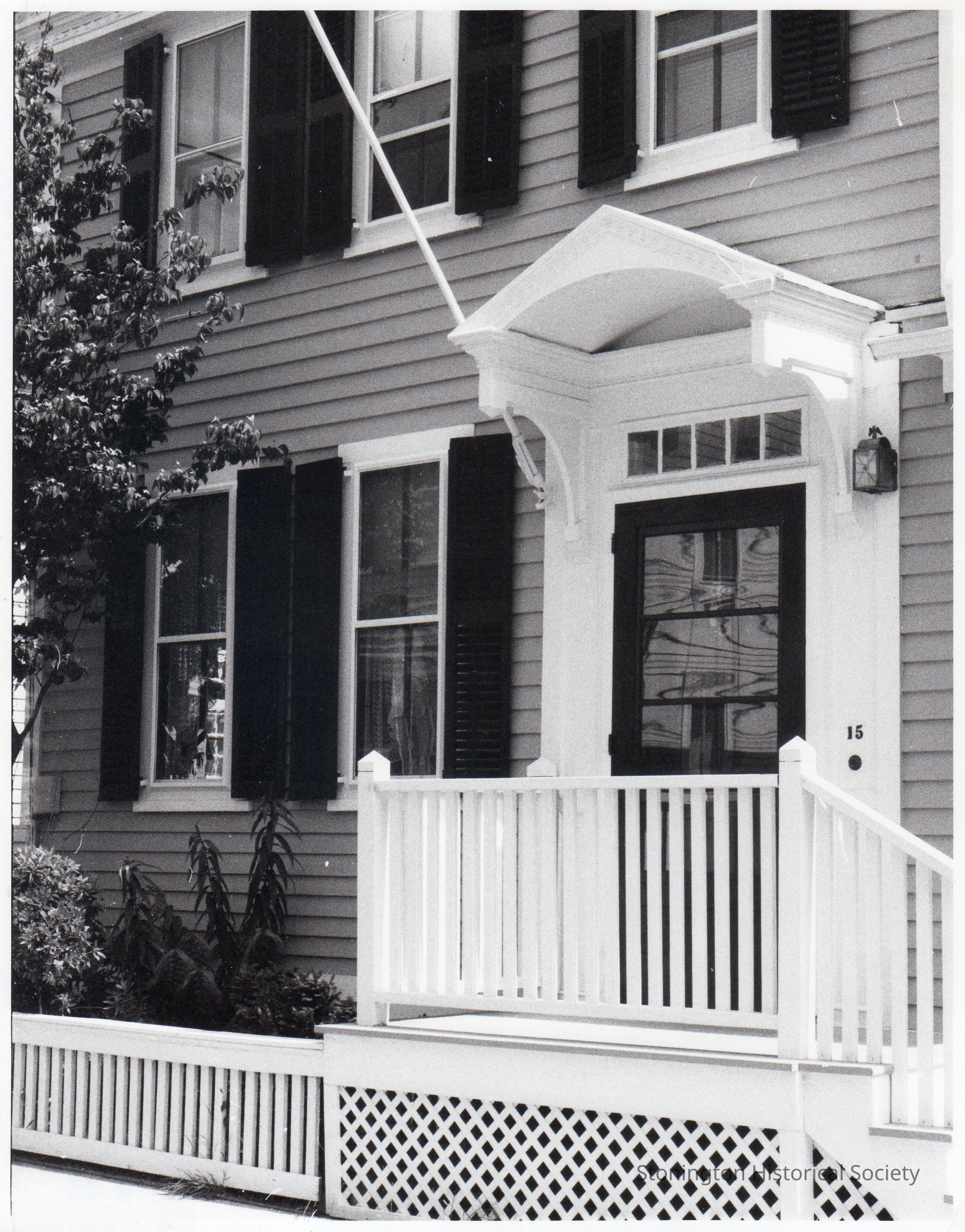 black and white photograph of the front door at 15 Grand Street in Stonington Borough, photographed by Mary Thacher.