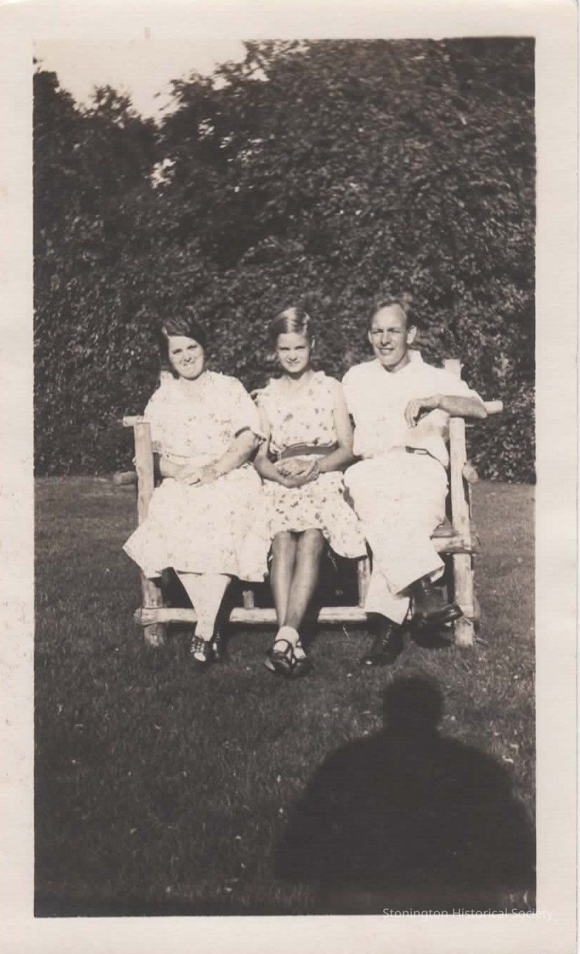 black and white photograph Edith, Mary and Wilson Kirk at the Shawondasee Estate, 1932. Wilson Kirk was cartetaker of the estate for Joseph and Helen Shelton.
