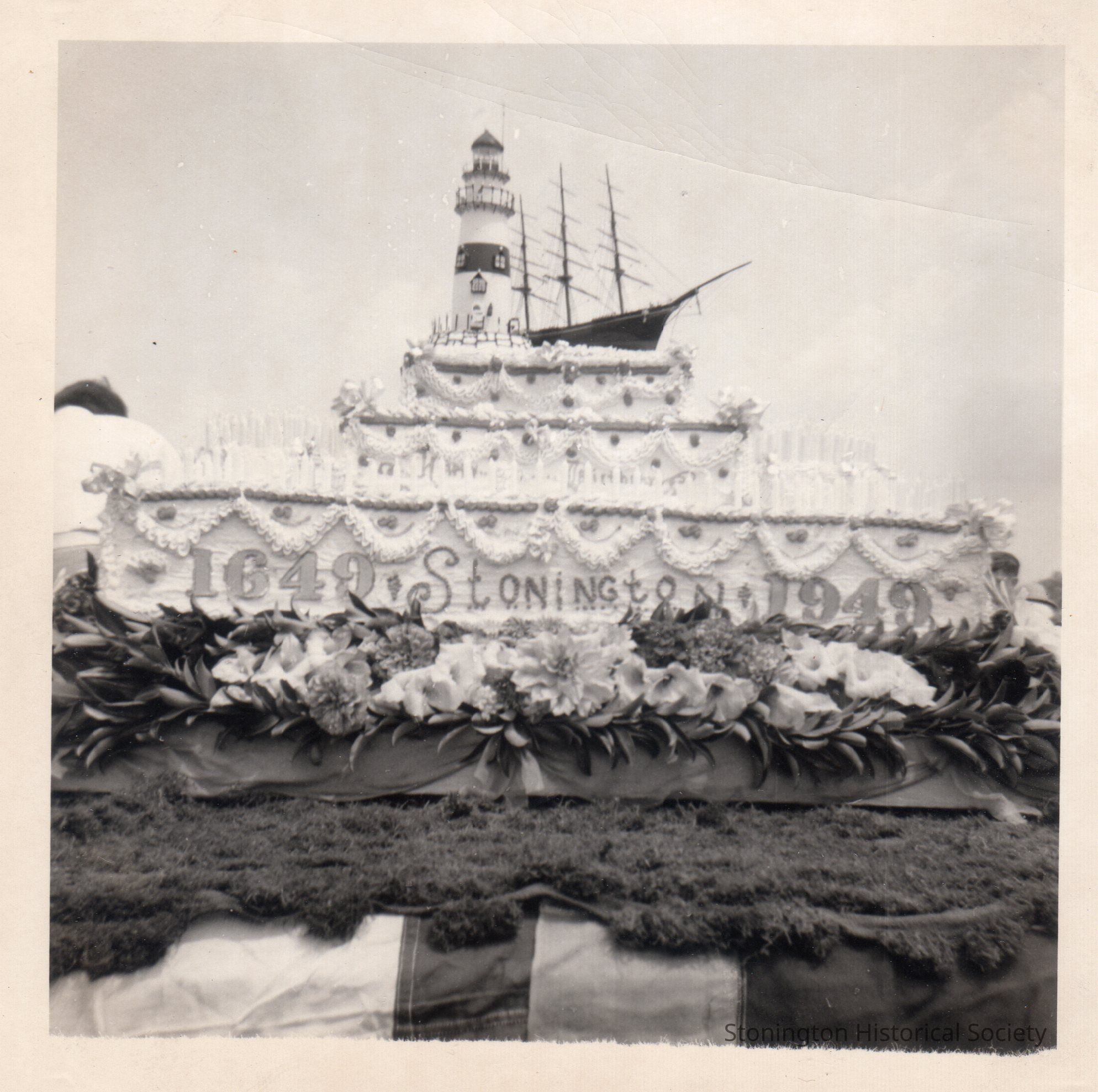 6 black and white snapshots of the Stonington tercentary parade and "birthday" cake, 1949. Photographed by Franklin R. Hoadley, Jr.Collection