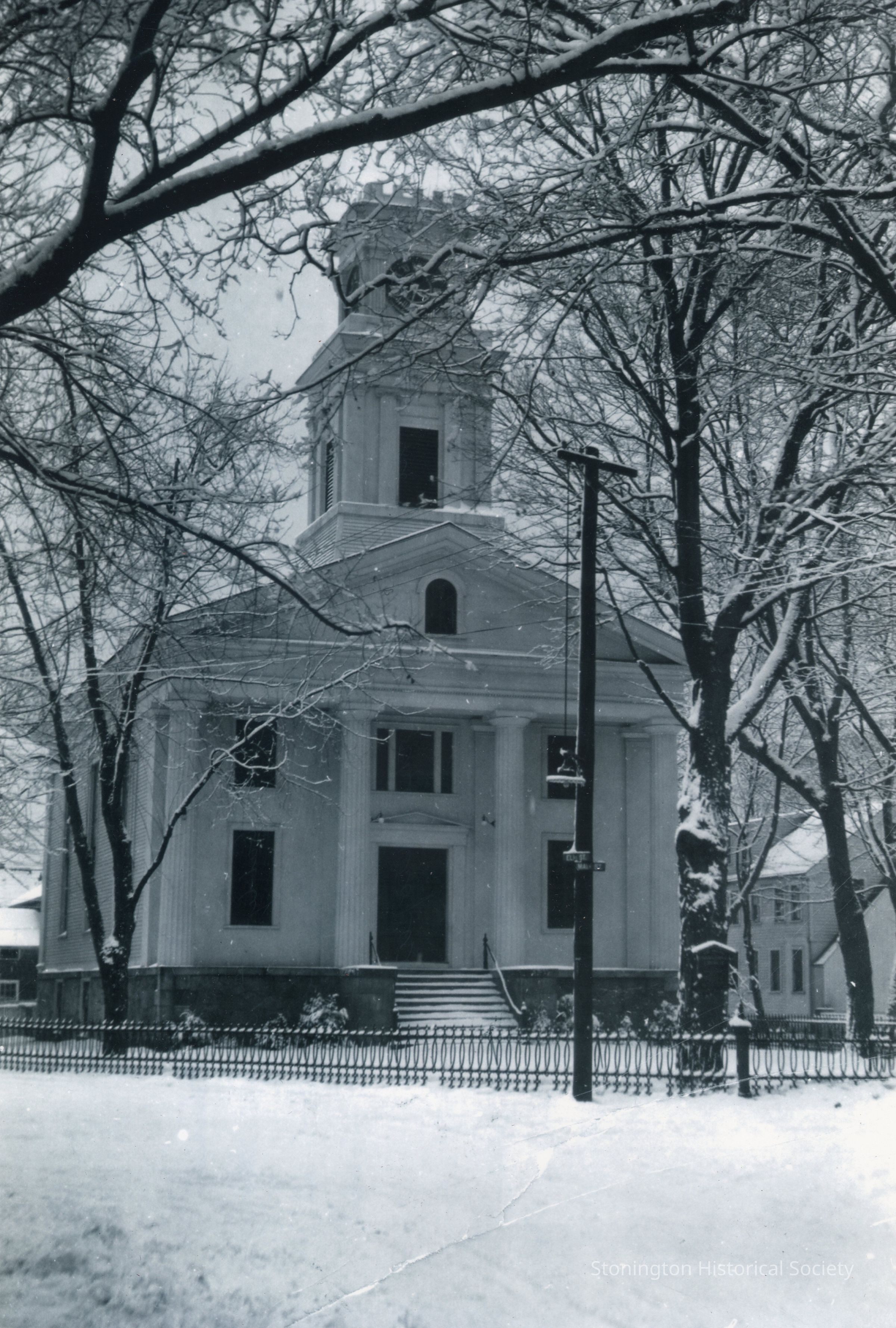 Photograph from the Harry Northup album (2015.019.002), enlarged print (snapshot missing), United Church of Stonington. Caption from Harry Northrup: "A winter scene of the Congregational Church in the village. It was probably taken in the 1920s. Its too bad that the telephone pole is in the center of this picture. Note the iron fence that used to go around the property. The railroad right of way used to run right along the South side of the Church. It must have been something when the Minister was preaching and a train with its bell clanging was moving along the tracks."Collection
