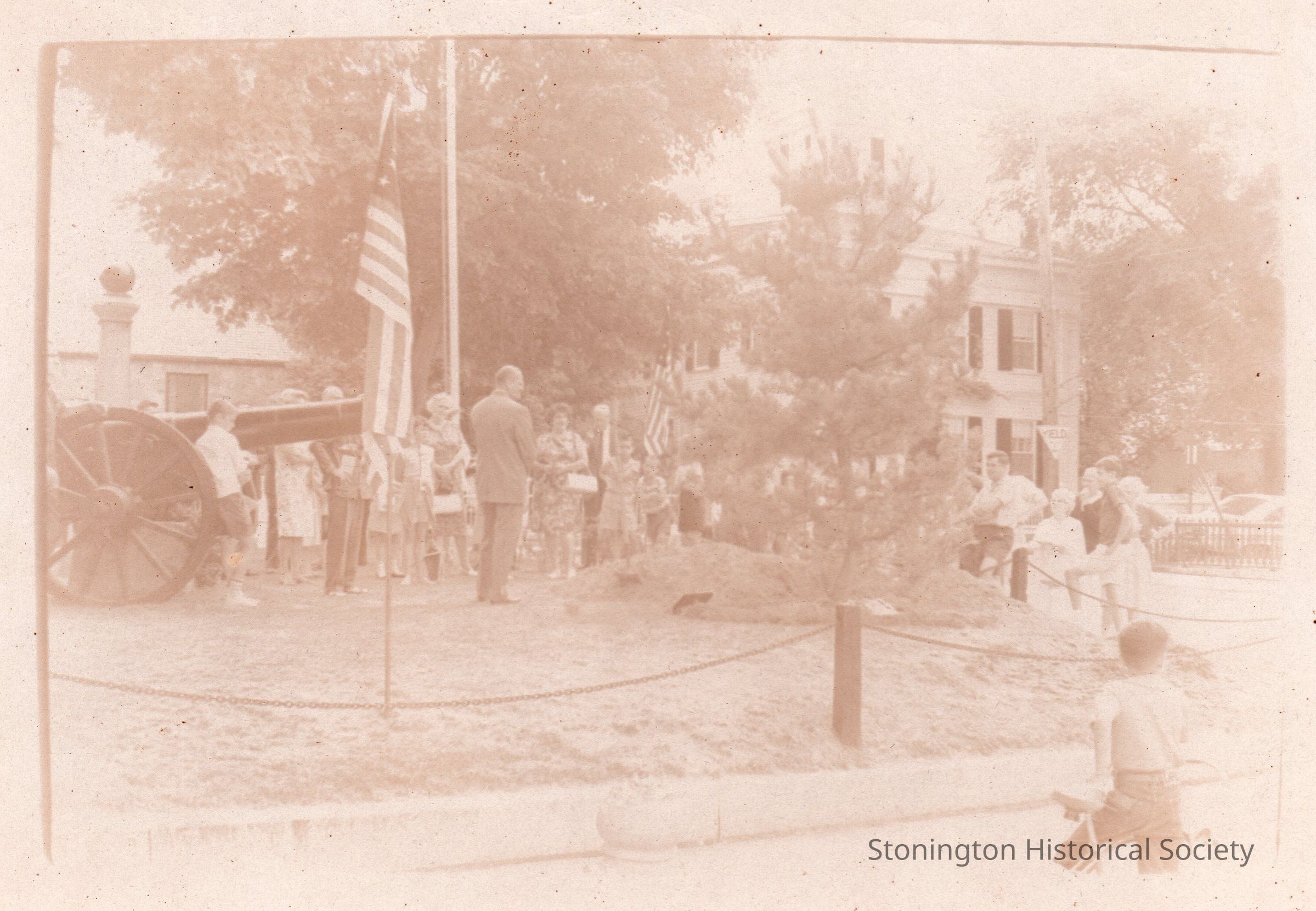 Black and white photograph of the tree planting ceremony at Canon Square in Stonington Borough, August 2, 1964. The pine tree was presented by the Village Improvement Association in commemoration of the 150th anniversary o fthe Battle of Stonington.Collection