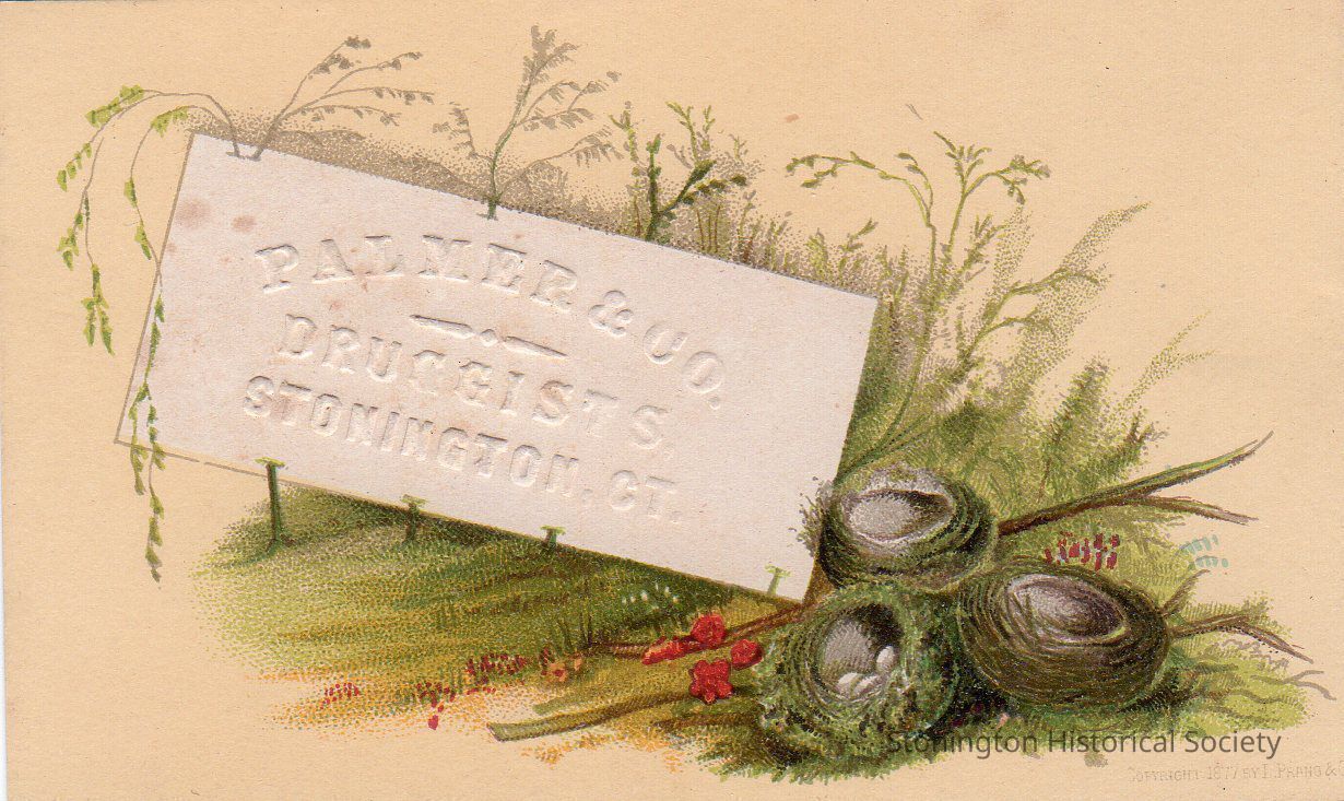 Trade card for Palmer & Co., Druggists, Stonington, CT, c. 1877. Palmer & Co. was located at 151 Water Street in Stonington Borough and sold "drugs, chemicals, patent medicines, toilet and fancy articles, sponges, brushes, perfumery, stationery and school books, confectionary, cigars and tobacco."Collection