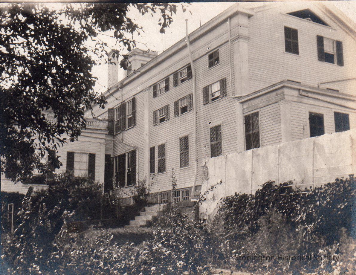 Black and white photograph of the southeast corner of the Charles Phelps Williams House, 39 Main Street, Stonington.