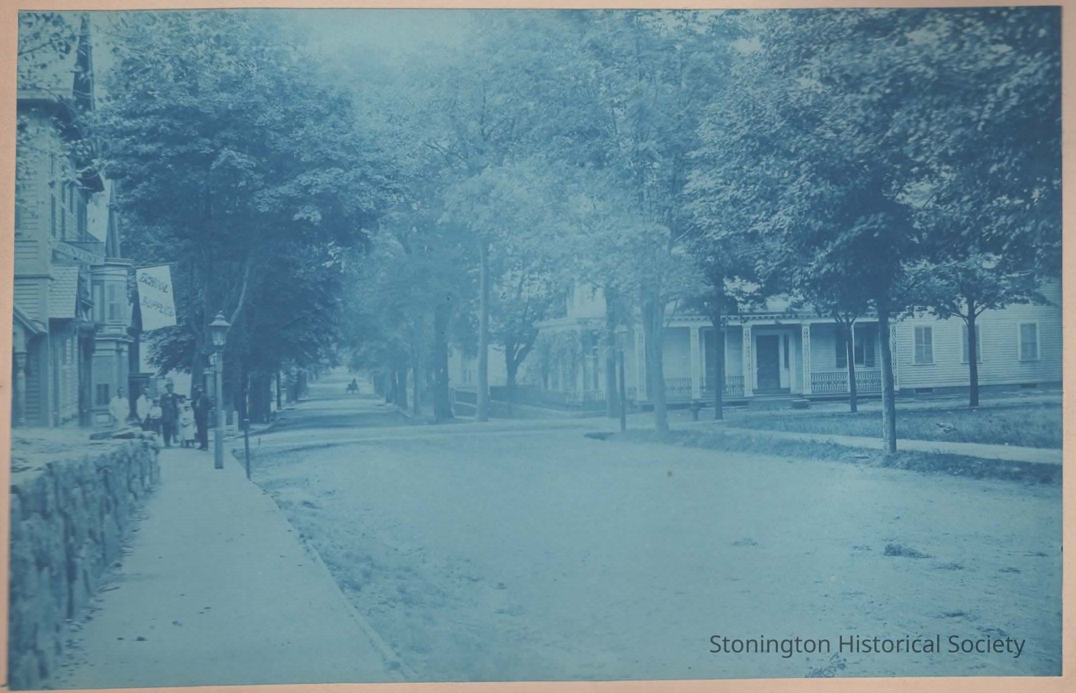 Cyanotype mounted on board, Southeast corner of Wadawanuck Square, looking south down Main Street. The Ira Palmer House is visible on the right and James H. Weeks' dentist office on the left (79 Main Street).Collection