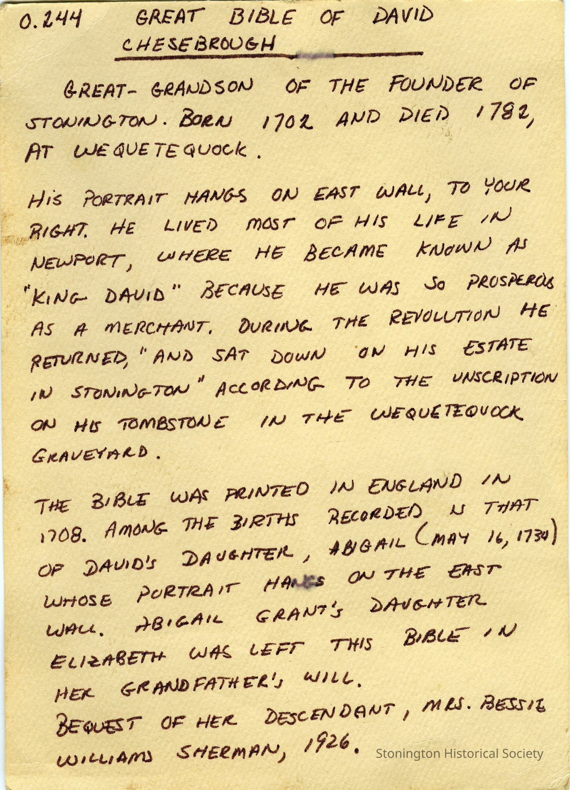 Great Bible of David Chesebrough (or Nathaniel Chesebrough?), with note card in box (see images)