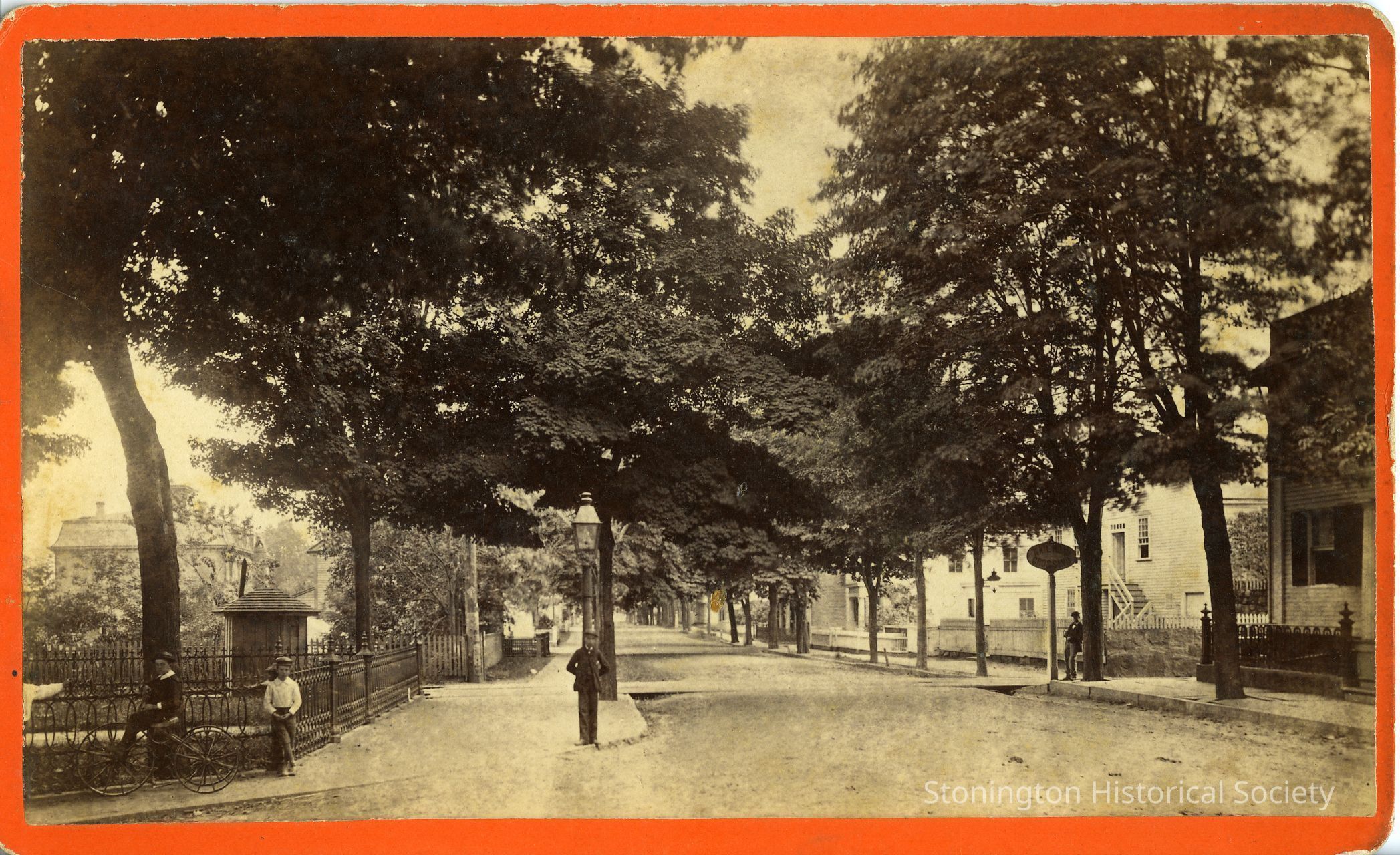 photograph, railroad crossing on Main Street, Boro Hall in background on the right, J.F. Trumbull House on right. Photo by A.E. Alden/Palmer & Co.Collection