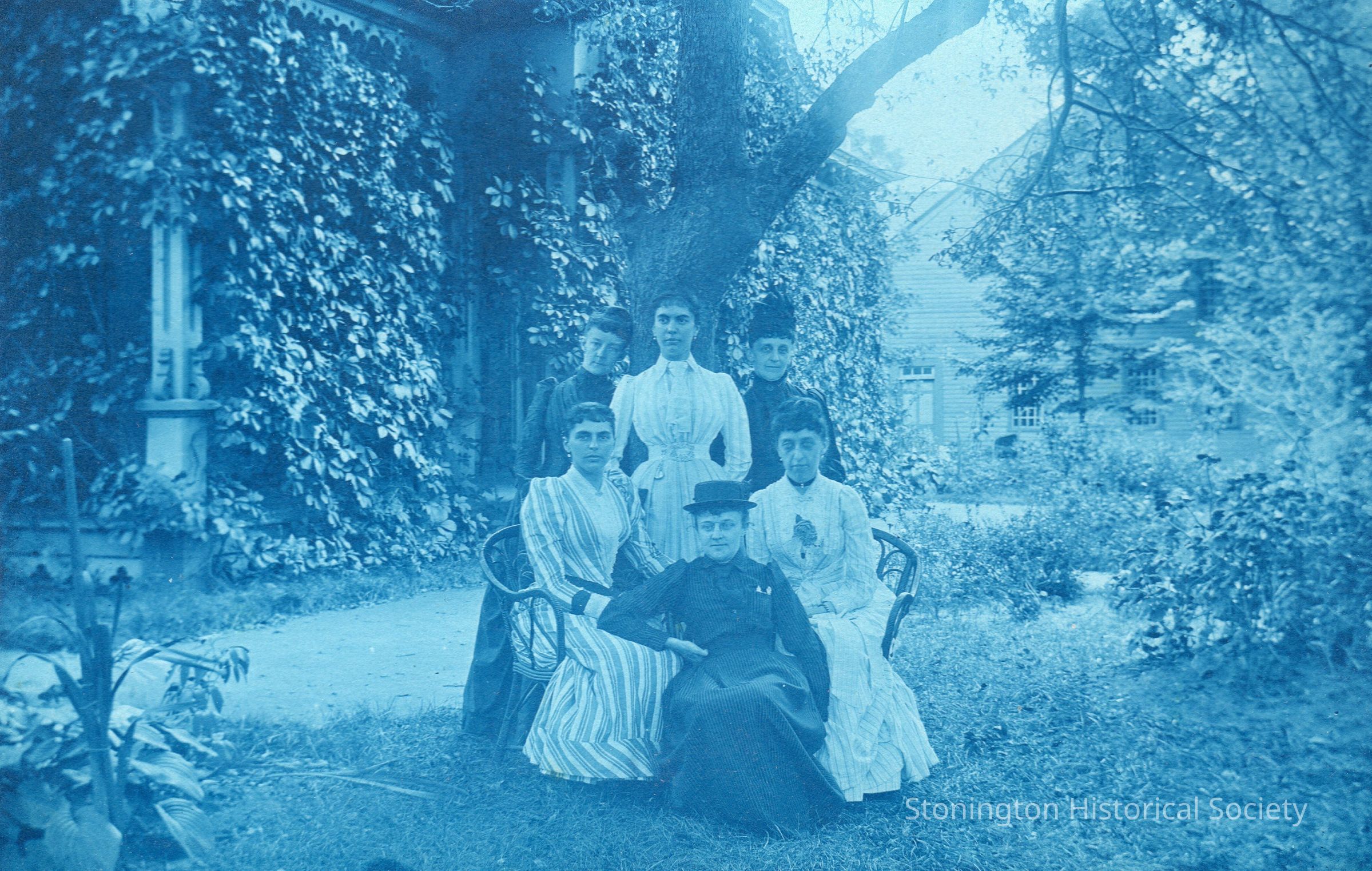 Cyanotype of women in the Trumbull family at the Culbert Palmer house (originally the Horace Niles House) at 85 Main Street off Wadawanuck Square, c. 1890.