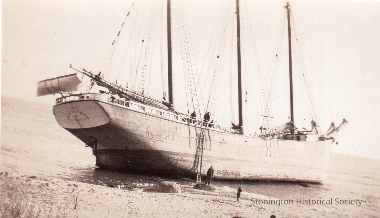 Black and white miniature postcard, appears to be the wreck of the GRANVILLE R. BACON off Weekapaug Point, December 20, 1933.
