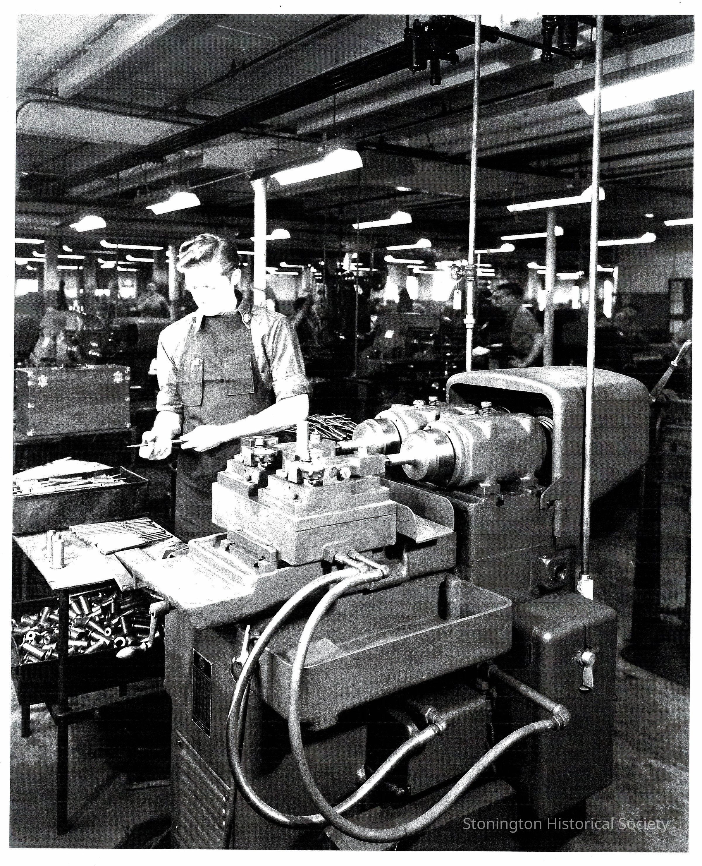 Worker standing next to a metal working machine, in the Atwood Machine Company, 1940s.