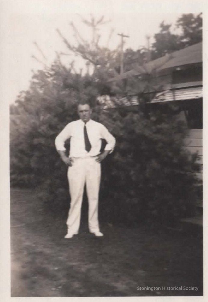 black and white snapshot, Allen Crouch in front of cabin where he stayed in Watkins Glen, N.Y., August 1938.