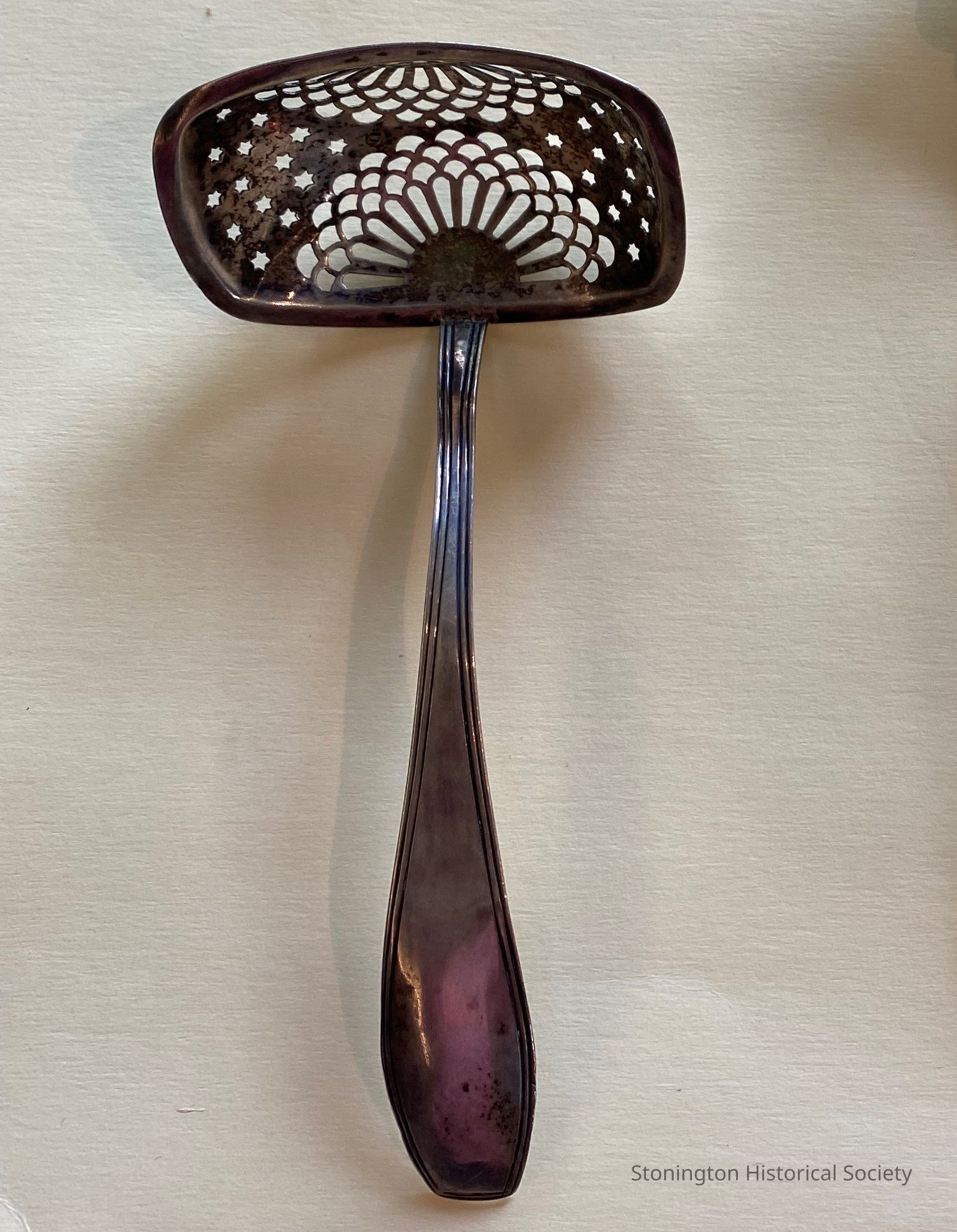 Silver tea strainer spoon, flower and star design
