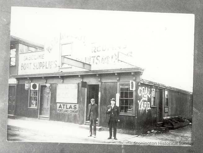 70 Water Street. W. P. Bindloss. Outside of supply store advertising Atlas Portland Cement, Coal Yard and Gasoline Boat supplies