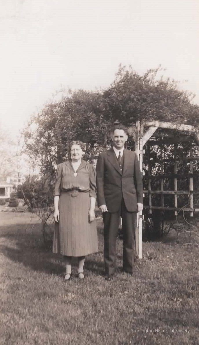 black and white snapshot, Ruby and Howard Crouch in Mrs. Burdick's yard, May 12, 1942. Taken just before Howard joined the military.Collection