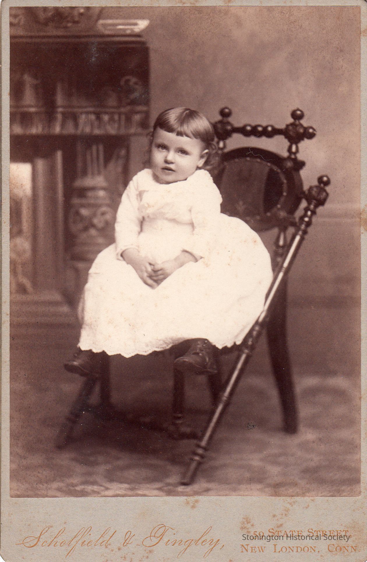 Photograph portrait, mounted on board, of Fannie Ella Fish (1888-1955) as a young child, taken by Scholfield & Tingley, c. early 1890s. Fannie was the daughter of Walter and Eunice Fish and grew up on a farm on Prospect St. in Mystic.Made/Created