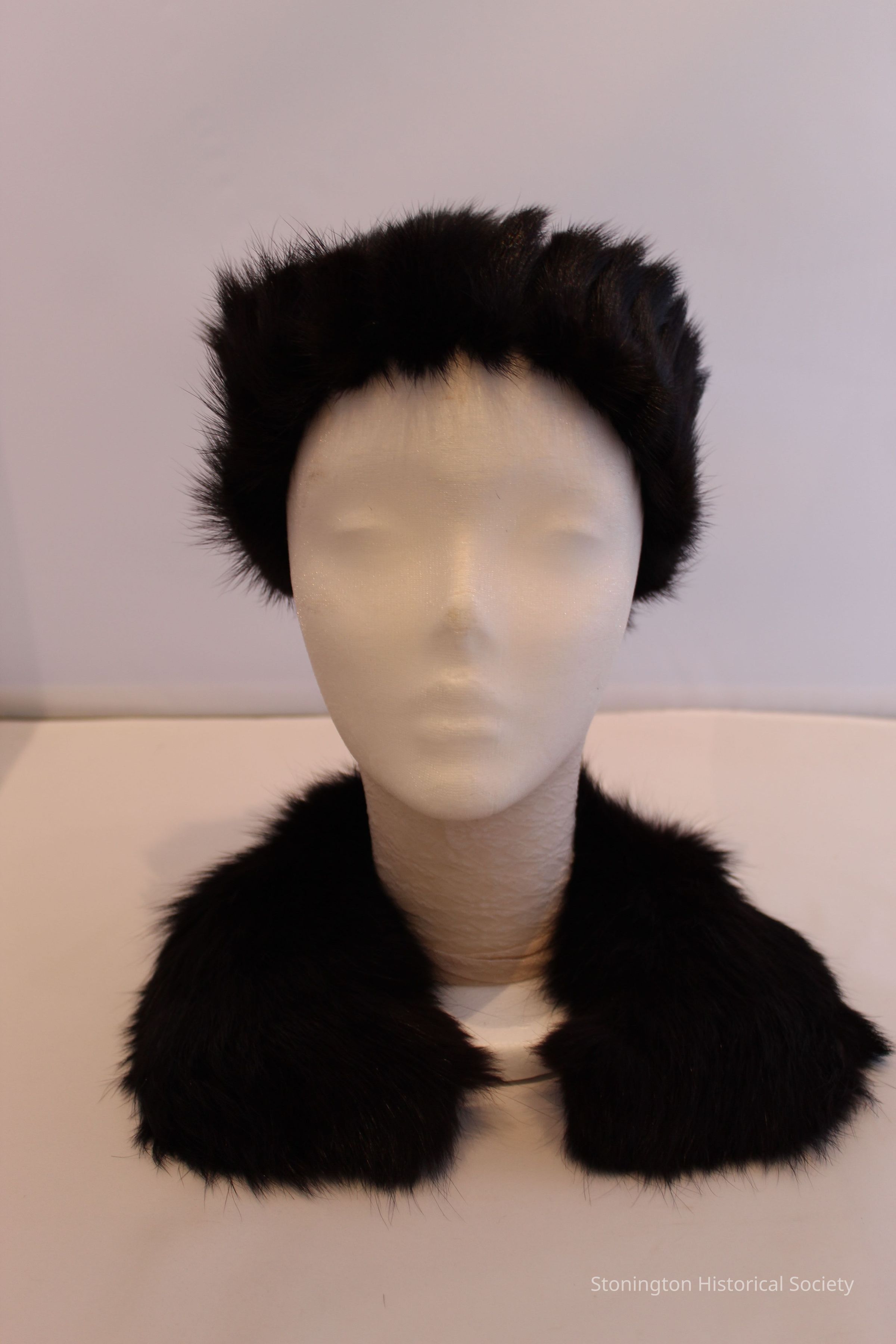 Womens black mink fur collar and hat. Collar is lined with a satin blend. Hat is cotton blend lined with an elastic band to keep it in place. Belonged to Philomena DeSimone McShane.