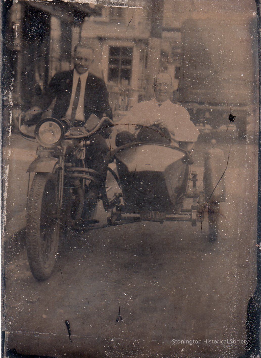 Tintype, "Jack Doyle (in white) and friend." Two gentlemen on a motorcycle and sidecar, late 1800s.