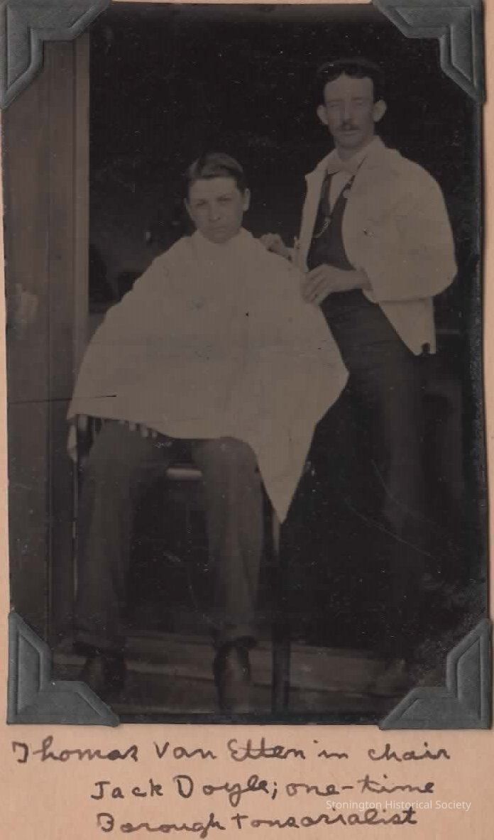 Tintype, "Thomas Van Etten in chair and Jack Doyle; one-time Borough tonsorialist," late 1800s. (A tonsorialist is a barber or hairdresser).