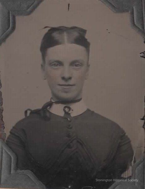 Tintype, "Hannah Sheffield, Pawcatuck." Late 1800s. From collection of loose pages from a photograph album scrapbook (with many of the photographs loose, having fallen off their original pages).