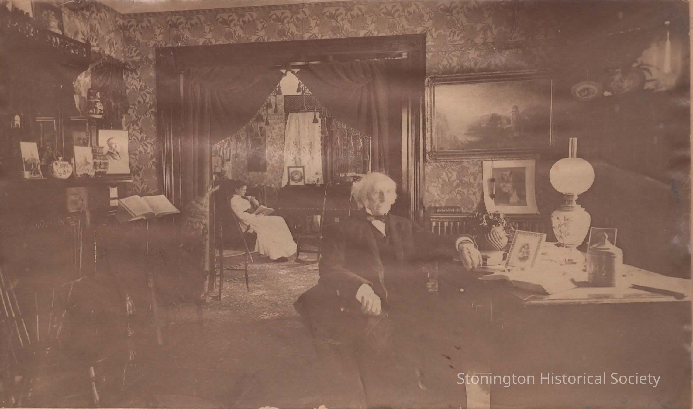Photograph of "Rev. A.G. Palmer and his daughter, Sara in new Baptist Church Prasonage. He was born May 11, 1813, died June 30, 1891."