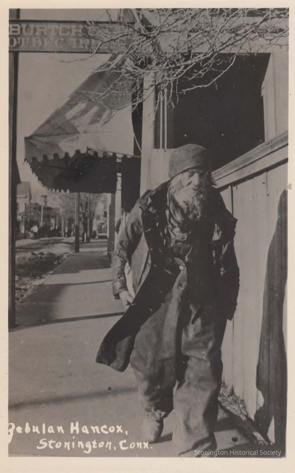 Photograph postcard of Zebulon Hancox walking in Stonington Borough. From collection of loose pages from a photograph album scrapbook (with many of the photographs loose, having fallen of their original pages).