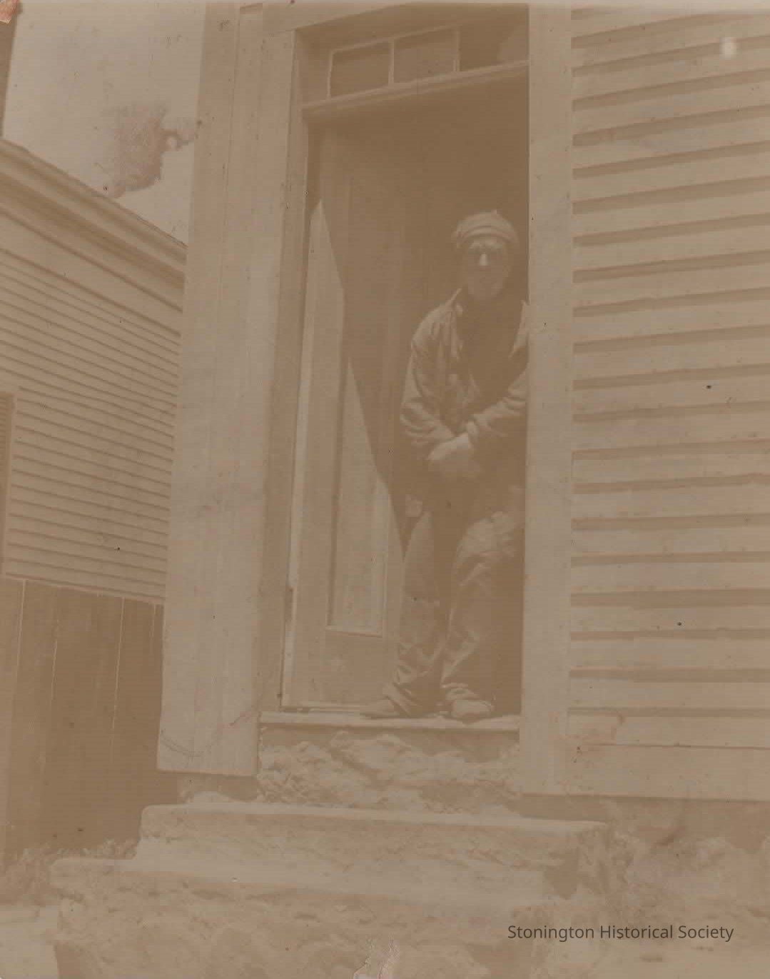 Photograph of Zebulon Hancox in the doorway of his home in Stonington Borough.